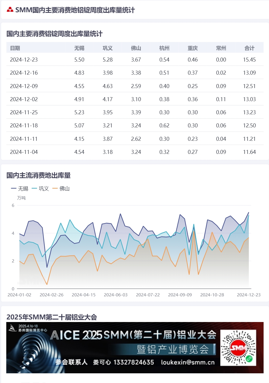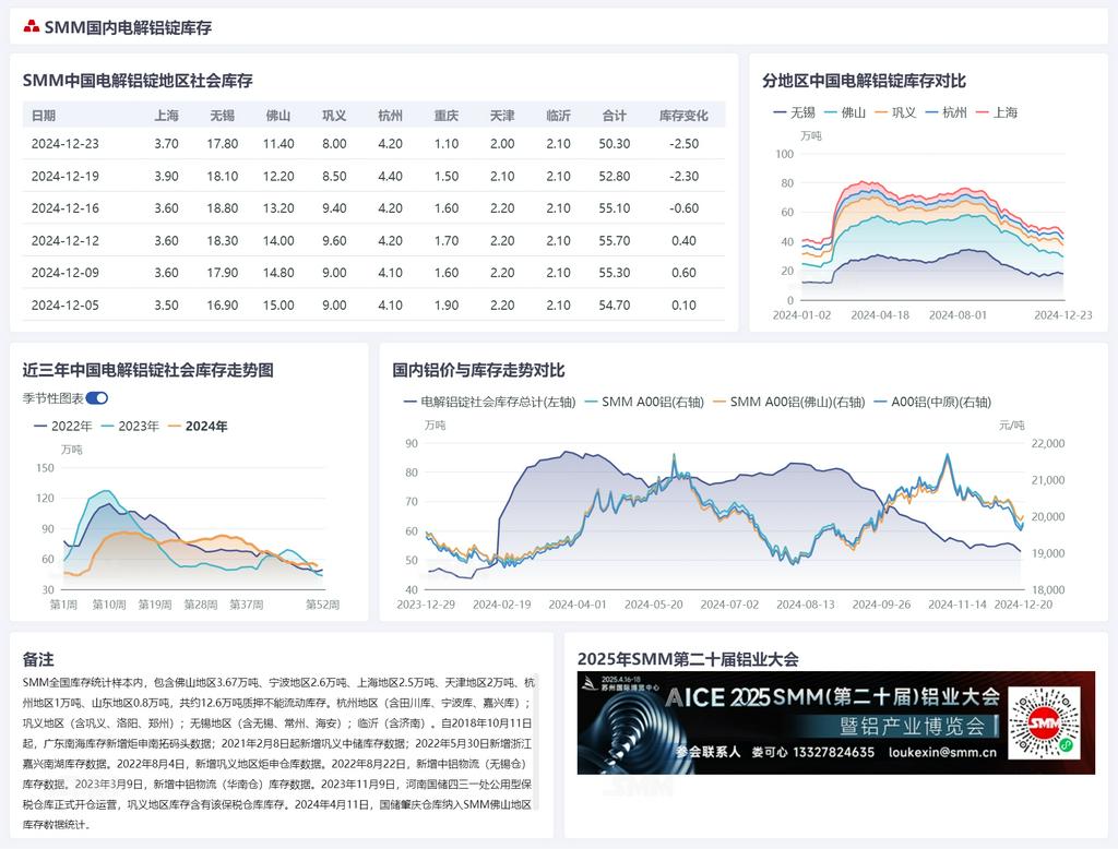 同时,近一周的连续去库,推动国内铝锭库存逼近50万吨大关。据SMM统计,截至2024年12月23日,SMM统计国内电解铝锭社会库存50.3万吨,国内可流通电解铝库存37.7万吨,较上周四去库2.5万吨。除上文分析的出库迅猛因素外,到货方面,近期新疆地区发货受12月中旬煤炭保供因素影响,到货整体维持稳定且仍有一部分积压量未能发出,同时国内整体处于长单谈判期到货较少,多个铝厂已提前超额完成了年度销售任务,外发铝锭的节奏已明显放缓。同比来看,当前国内铝锭库存较去年同期高出7.0万吨。