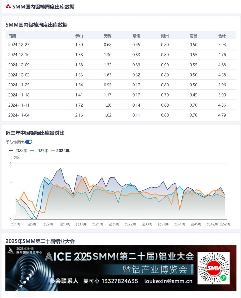 周末铝棒库存和出库率先出现初步拐点,符合下游消费端的预期。铝棒库存方面,因西北地区包括新疆、宁夏等地发运在途明显增加,周末出现集中到货的情况,据SMM统计,截至12月23日,国内铝棒社会库存为9.90万吨,较上周四大幅累库0.99万吨,重新逼近10万吨的库存大关,铝棒货源略显偏紧的情况得到明显缓解。同比来看,较去年同期差距拉开至3.49万吨,仍处于近三年同期高位的位置。出库方面,上周铝棒出库量环比锐减0.83万吨至3.93万吨。尽管前段时间部分下游有逢低进行年末备库的意愿,但受下游开工表现不佳的抑制,叠加近期加工费偏高影响,相较铝锭出库的迅猛表现,铝棒出库逆势保持高位的持续性则处于下风。