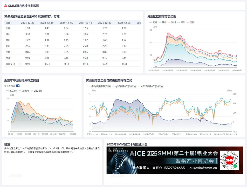 SMM预计,因铝型材板块淡季氛围渐趋浓厚,铝型材开工率维持偏弱运行。年底阶段,国内铝棒仍处于供需双弱的格局中,且新疆地区积压有缓解迹象,发往华东、华南等地的铝棒在途存在明显增量预期,后续到货或将得到较明显补充,月内国内铝棒库存或以持稳小增为主,月底重回10万大关或已是板上钉钉。同样需要密切观察年末放假前下游开工的变化情况、以及铝价进入回调阶段后对现货出库的带动作用是否持续。