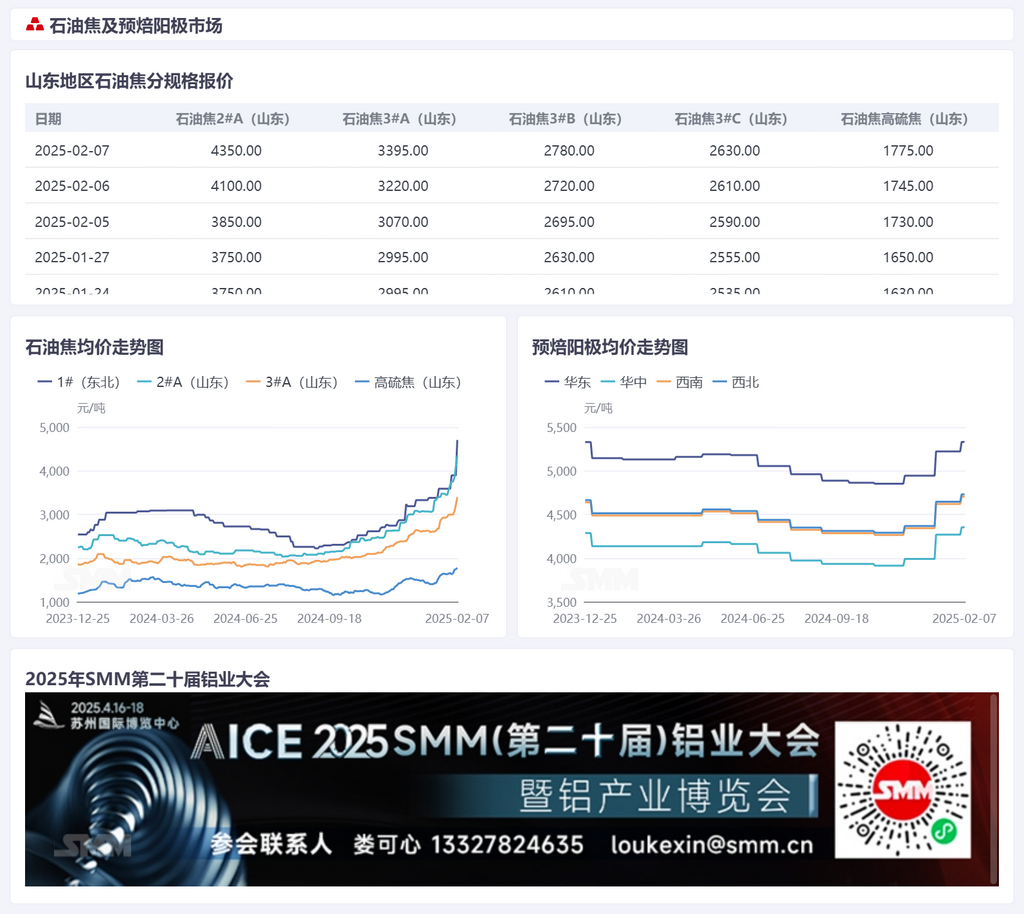 具体而言,中海油旗下各炼厂在本周内对石油焦价格进行了大幅度的上调。据SMM获悉,中海油旗下石油焦价格已攀升至 5500 元 / 吨,与上次竞价相比,涨幅高达 1,400 – 1,800元/吨。中石油旗下东北地区炼厂库存低位出货良好,经过多次调整后石油焦价格宽幅上调,尤其是2月8号,多家企业调整幅度高达到1,000元/吨,现报价在4,150-5,800元/吨。中石化方面,周内炼厂出货情况良好,石油焦价格应市上调,调整幅度集中在100-300元/吨之间。此外,地方炼厂的出货情况也表现良好,石油焦价格持续上调。截至本周五,地方炼厂的石油焦均价已达到约2,442元/吨,较节前周五涨幅达 15.7%。受国内石油焦价格强势上涨影响,港口石油焦价格也迅速上扬。进口石油焦出货情况良好,不过据 SMM 了解,目前进口石油焦贸易商普遍看涨后市价格,大部分企业选择停止出货,观望市场动态。