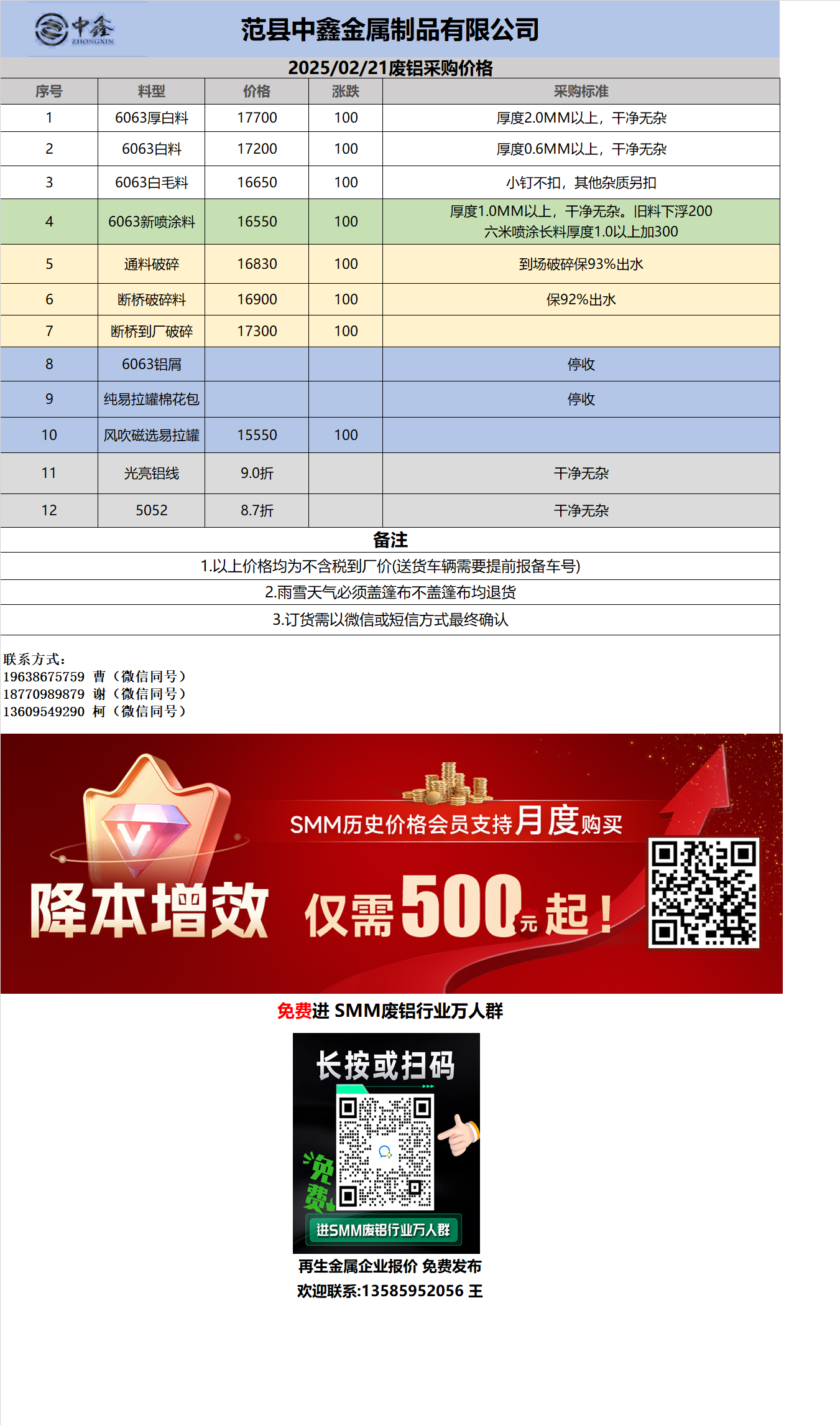 2月21日范县中鑫金属 废铝采购报价