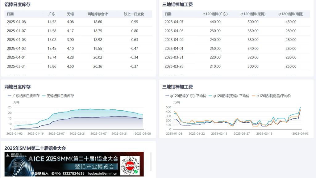 4月8日讯: 据SMM统计,国内铝棒两地库存方面,广东铝棒库存14.52万吨,无锡铝棒库存4.08万吨,合计18.60万吨,共计环比减少0.95万吨。