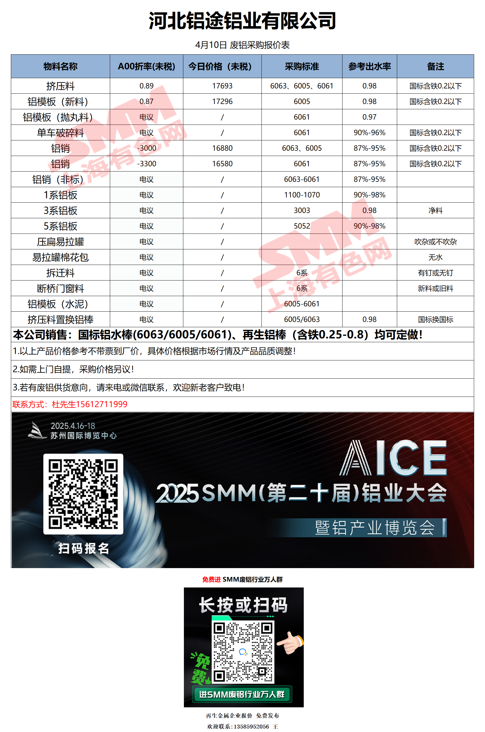 4月10日河北铝途 废铝采购报价