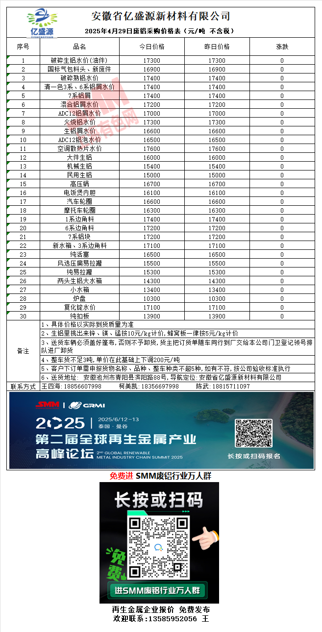 4月29日安徽亿盛源 废铝采购报价