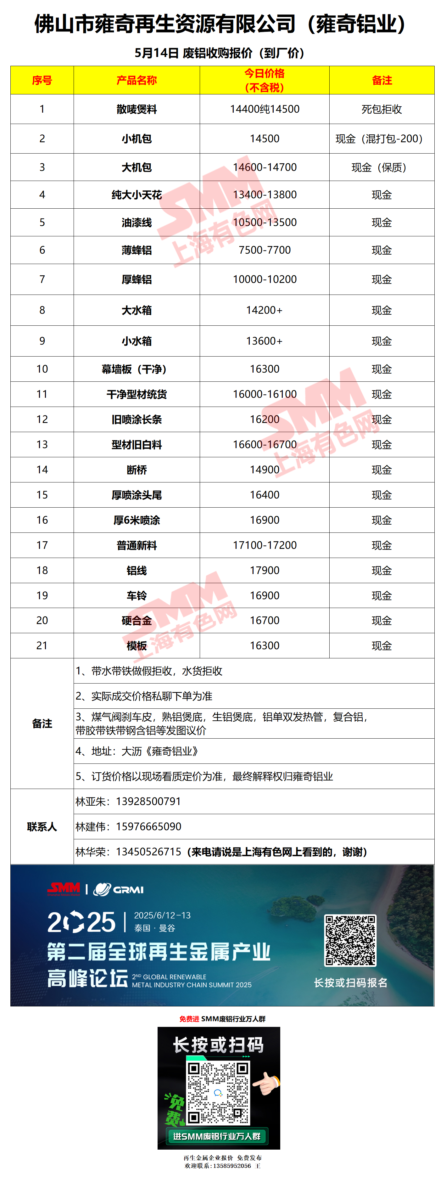 今日佛山雍奇 废铝采购报价已更新,有货的朋友欢迎联系我们!