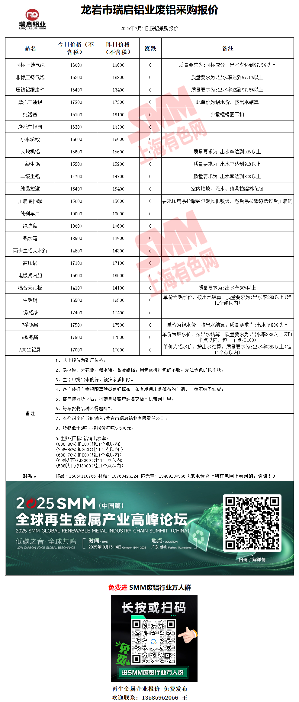 今日龙岩瑞启 废铝采购报价已更新,有货的朋友欢迎联系我们!