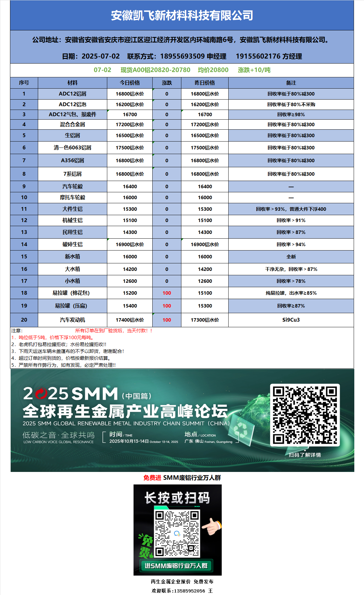 今日安徽凯飞 废铝采购报价已更新,有货的朋友欢迎联系我们!