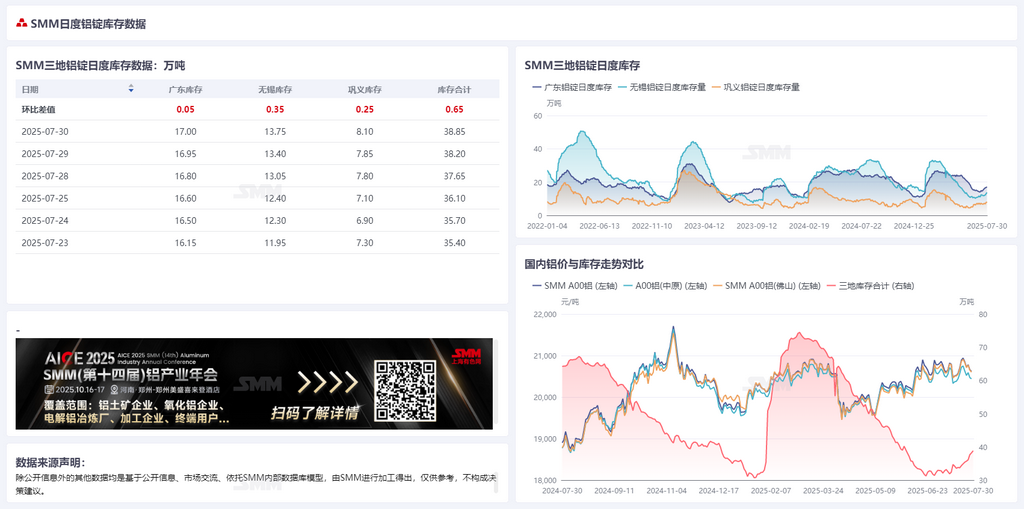 7月30日讯: 据SMM统计,7月30日广东铝锭库存17.00万吨;无锡铝锭库存13.75万吨;巩义铝锭库存8.10万吨,三地库存共计38.85万吨,较上一交易日增长0.65万吨。