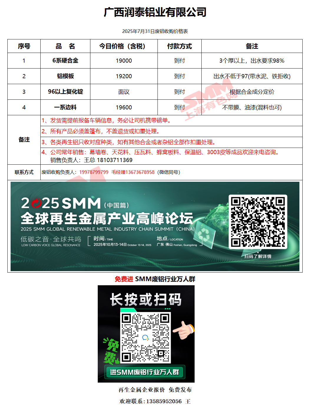 今日广西润泰铝业 废铝采购报价已更新,有货的朋友欢迎联系我们!