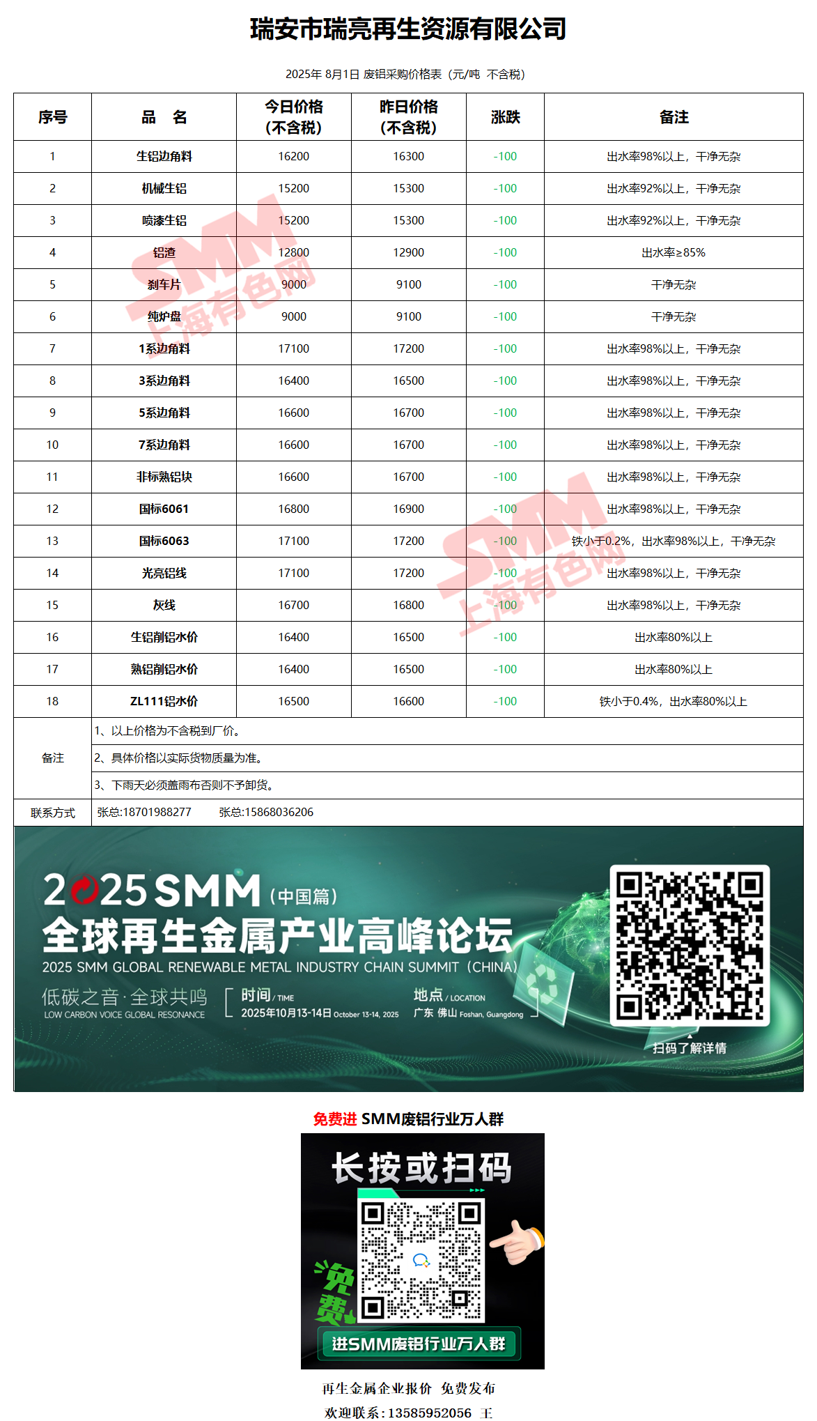8月1日瑞亮再生 废铝采购报价