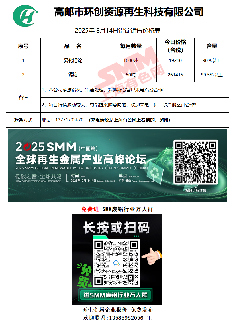 8月14日高邮环创铝业 废铝销售报价