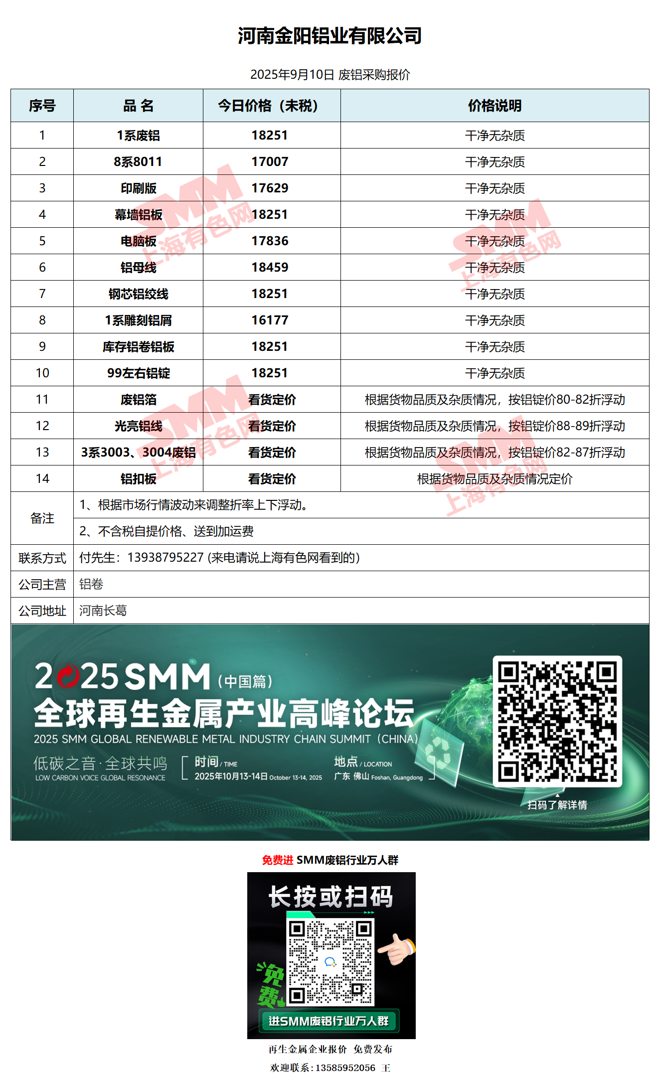 今日河南金阳铝业 废铝采购报价已更新,有货的朋友欢迎联系我们!