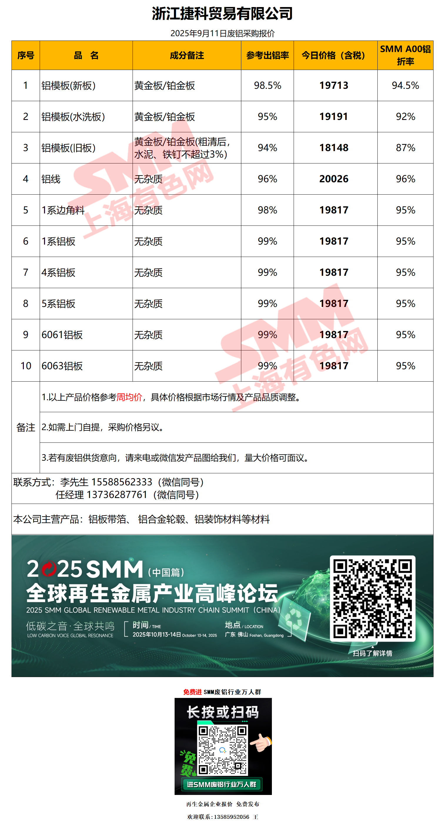 9月11日捷科贸易 废铝采购报价
