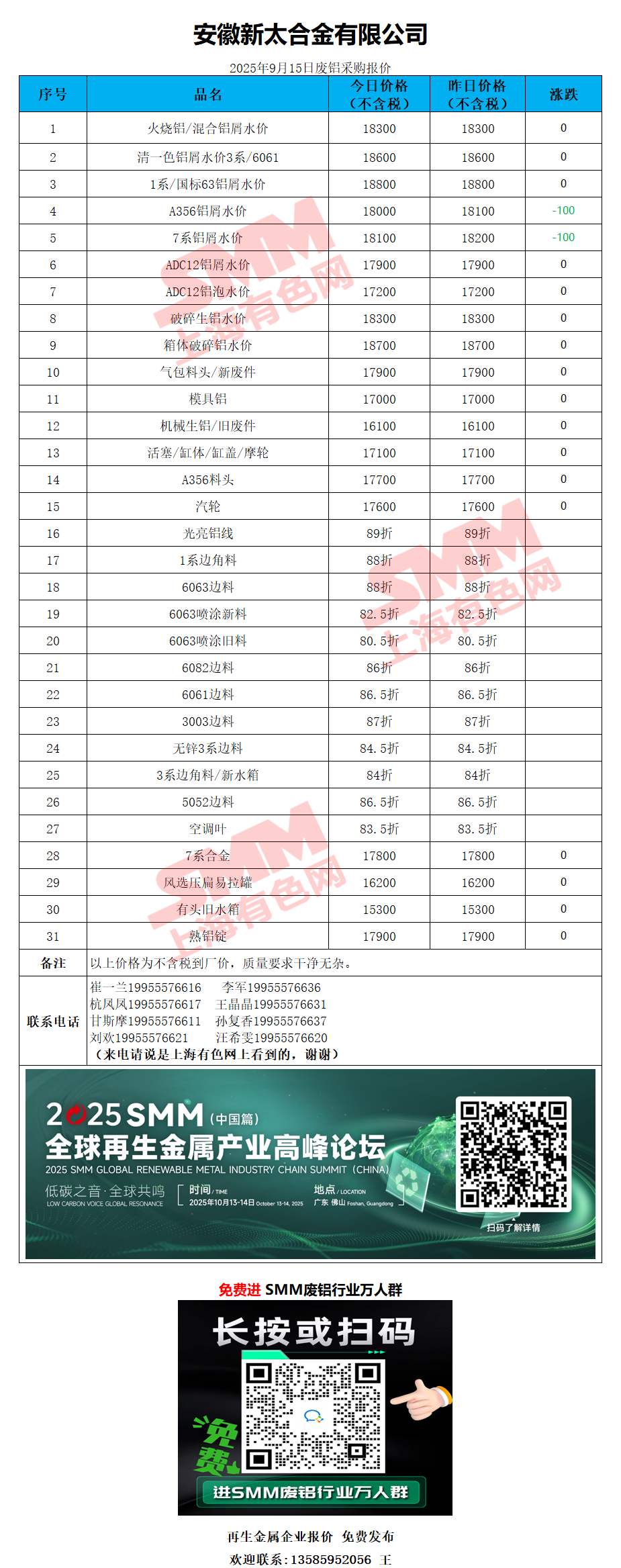 今日安徽新太 废铝采购报价已更新,有货的朋友欢迎联系我们!