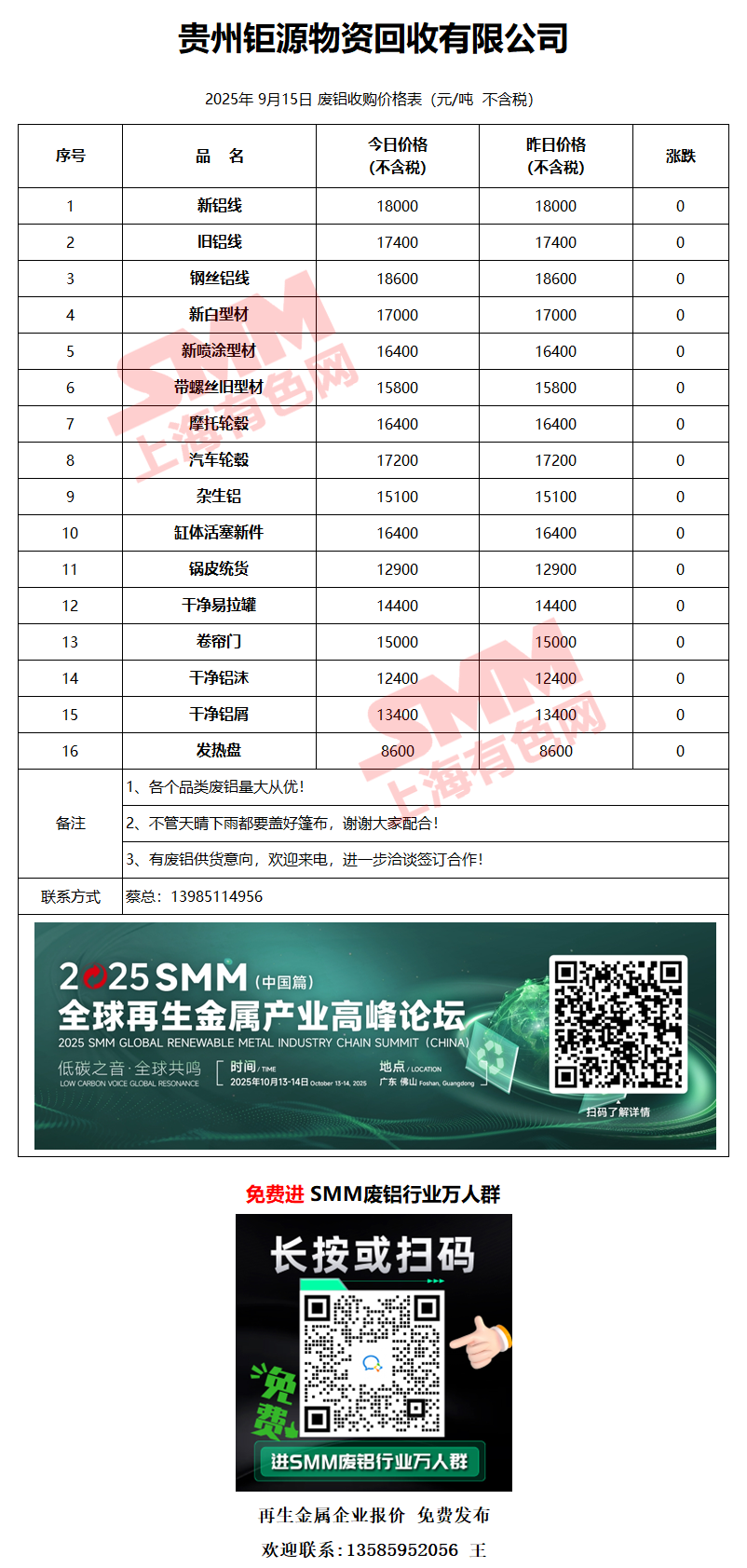 9月15日贵州钜源 废铝采购报价