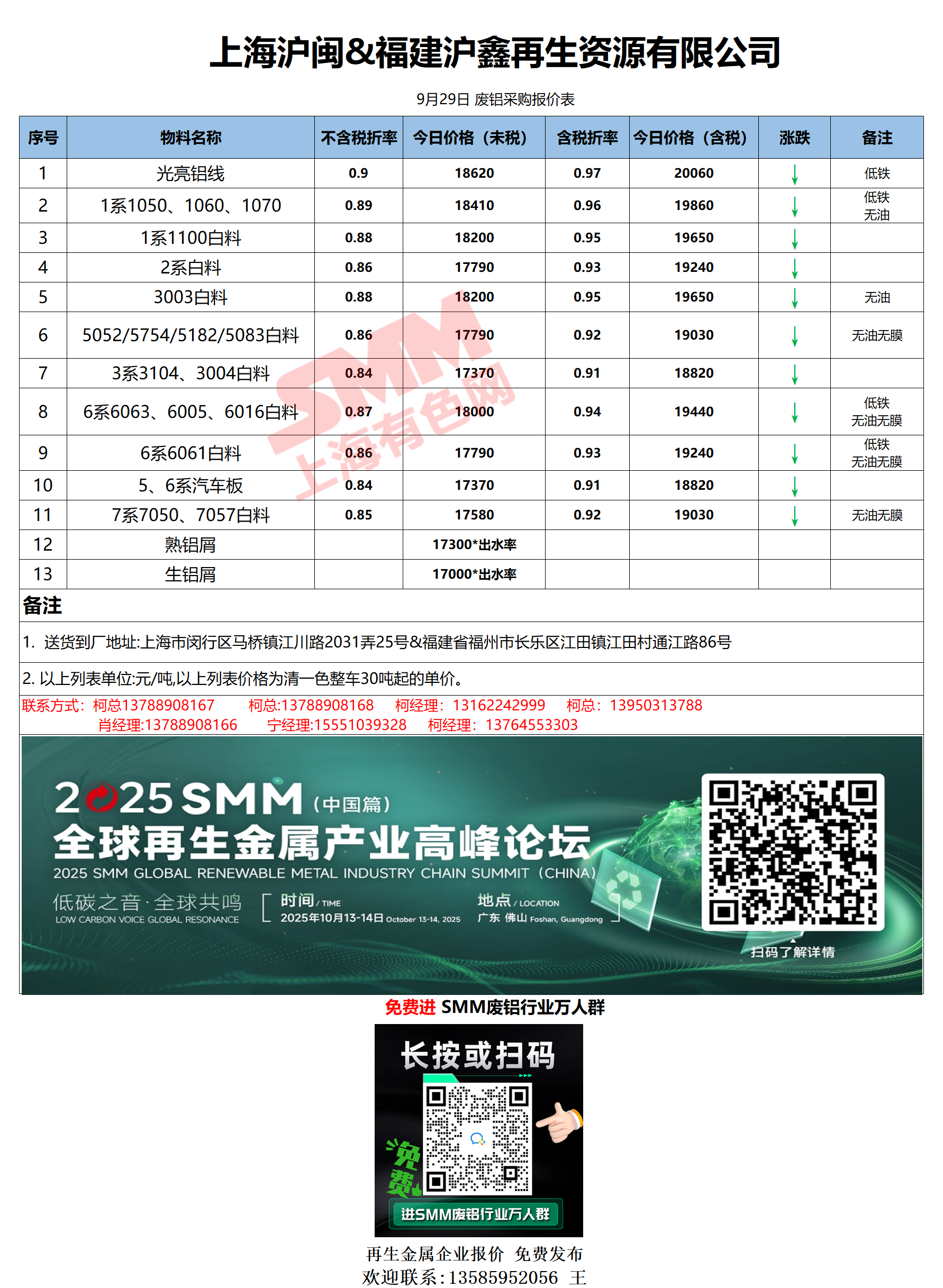 9月29日上海沪闽&福建沪鑫 废铝采购报价