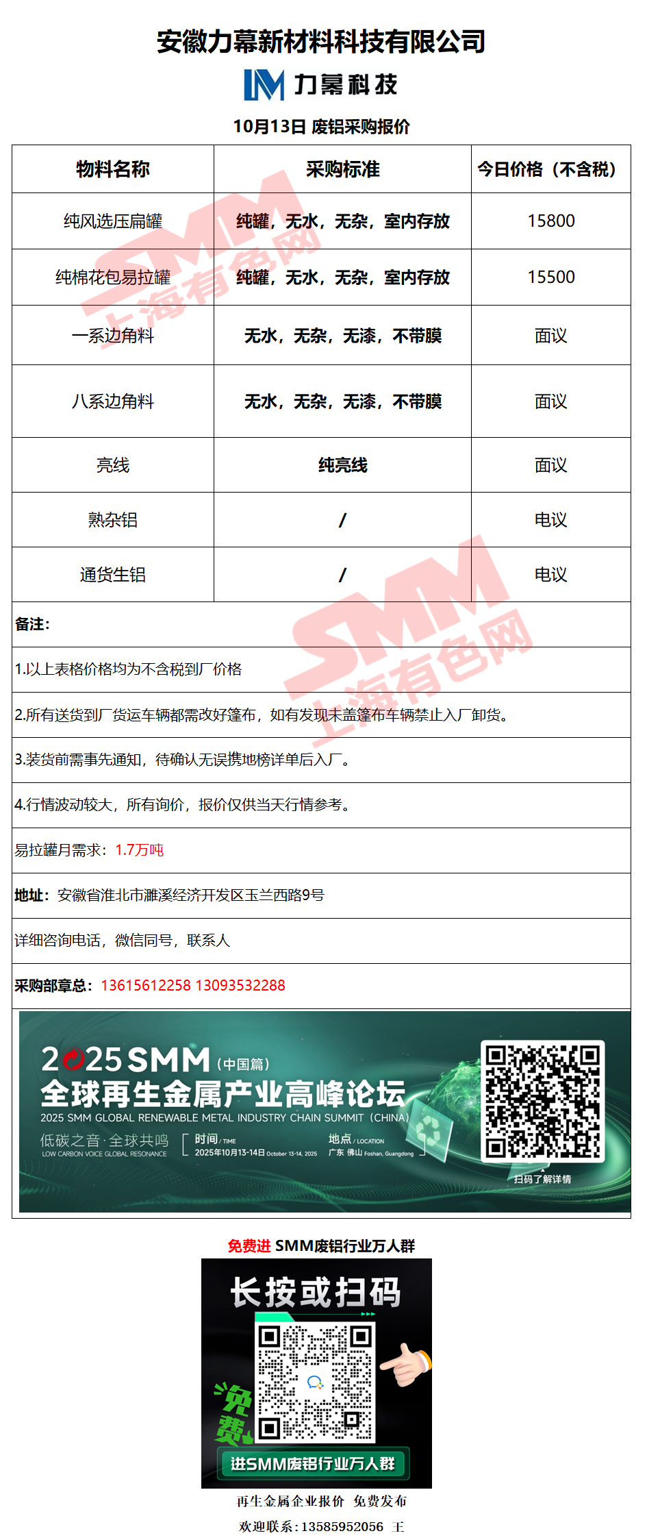 10月13日安徽力幕 废铝采购报价