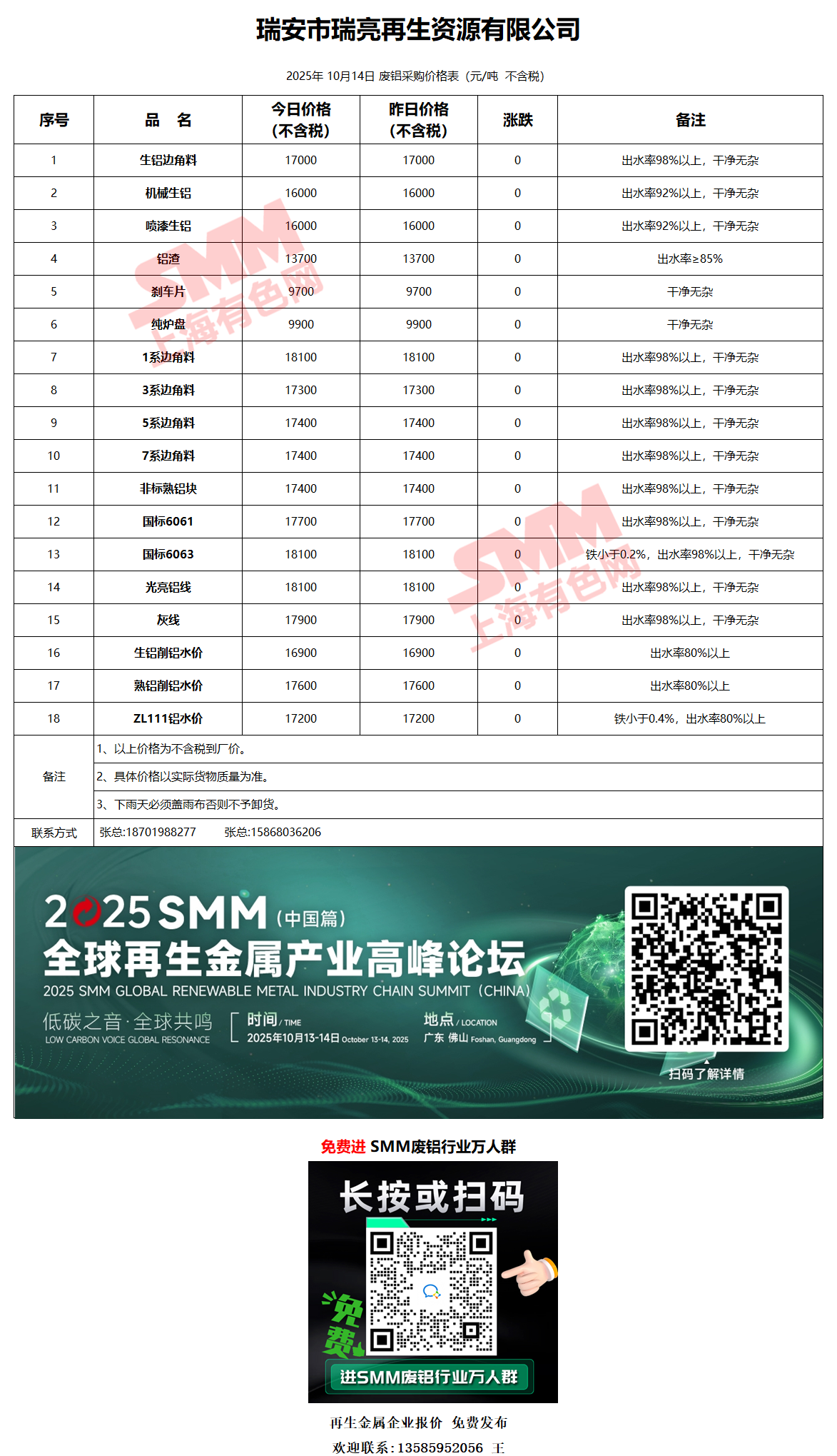 10月14日瑞亮再生 废铝采购报价