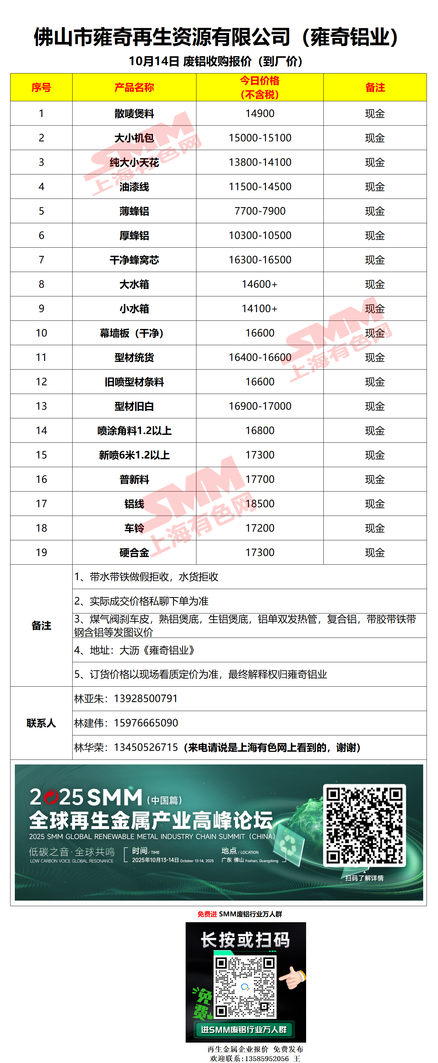 今日佛山雍奇 废铝采购报价已更新,有货的朋友欢迎联系我们!
