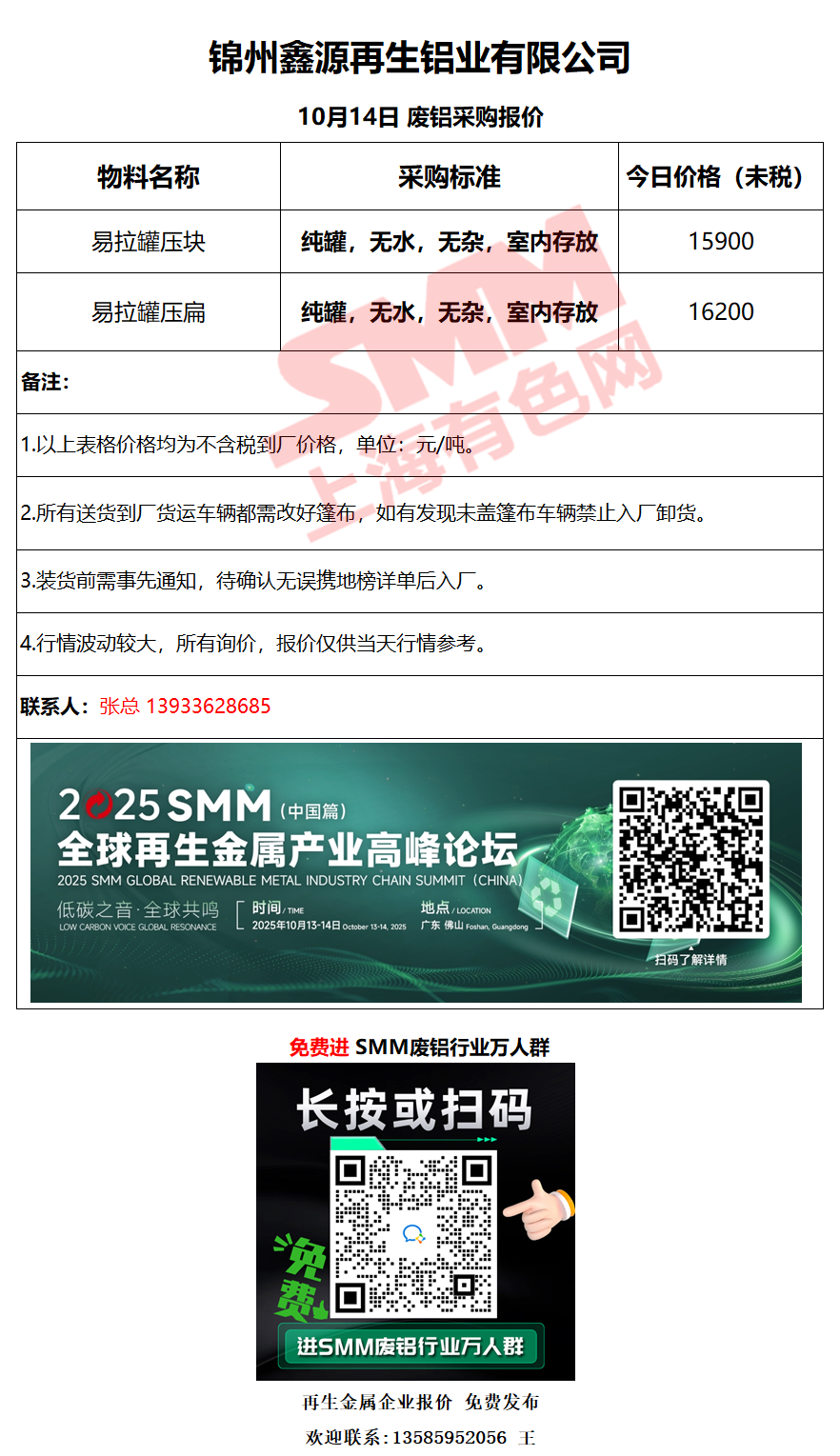 今日锦州鑫源 废铝采购报价已更新,有货的朋友欢迎联系我们!