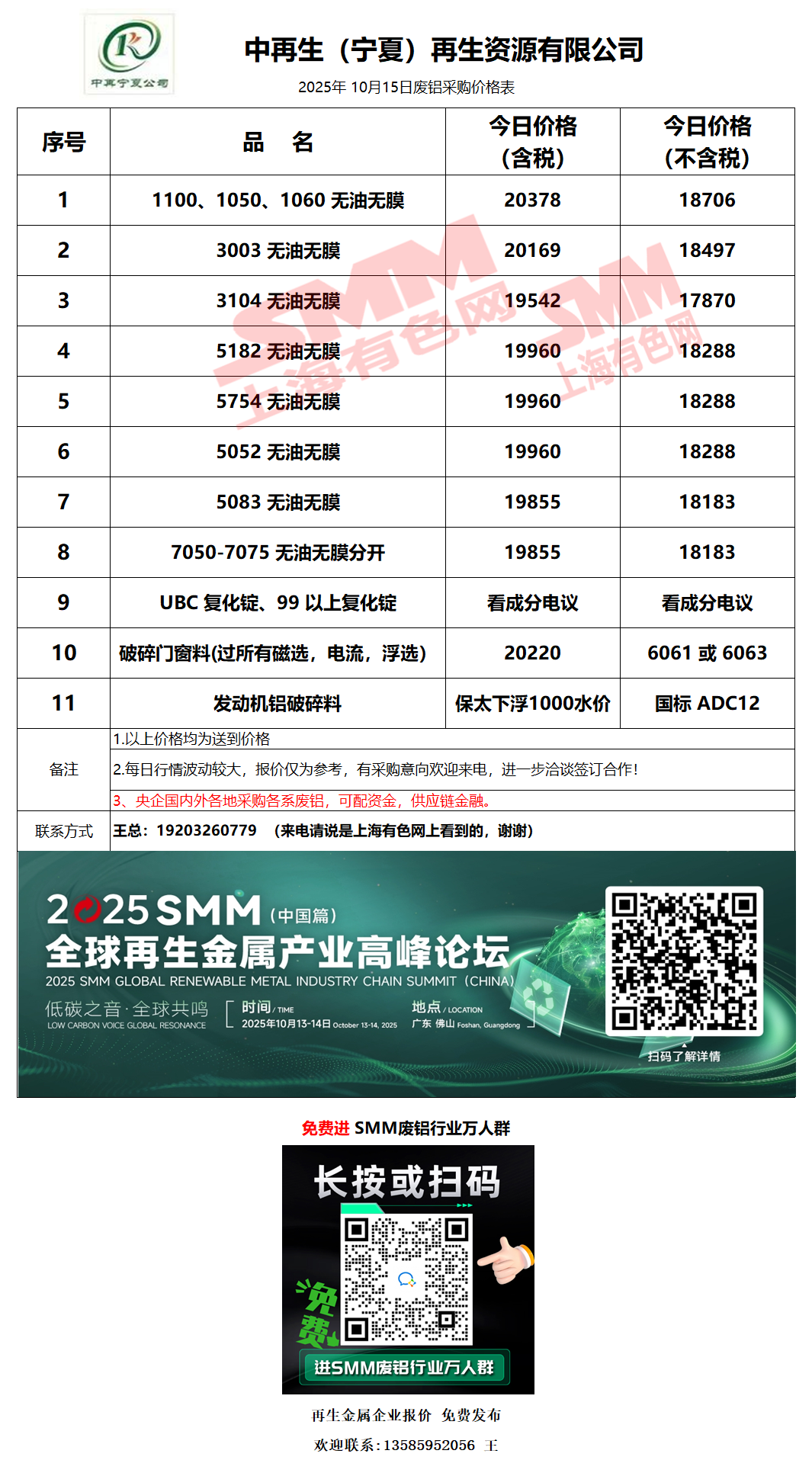 10月15日中再宁夏 废铝采购报价