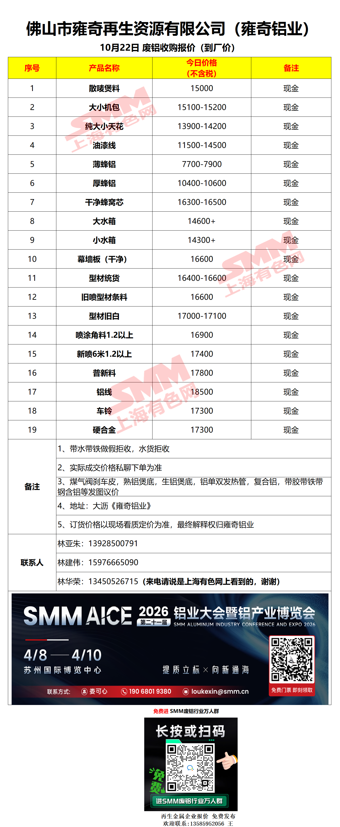今日佛山雍奇 废铝采购报价已更新,有货的朋友欢迎联系我们!