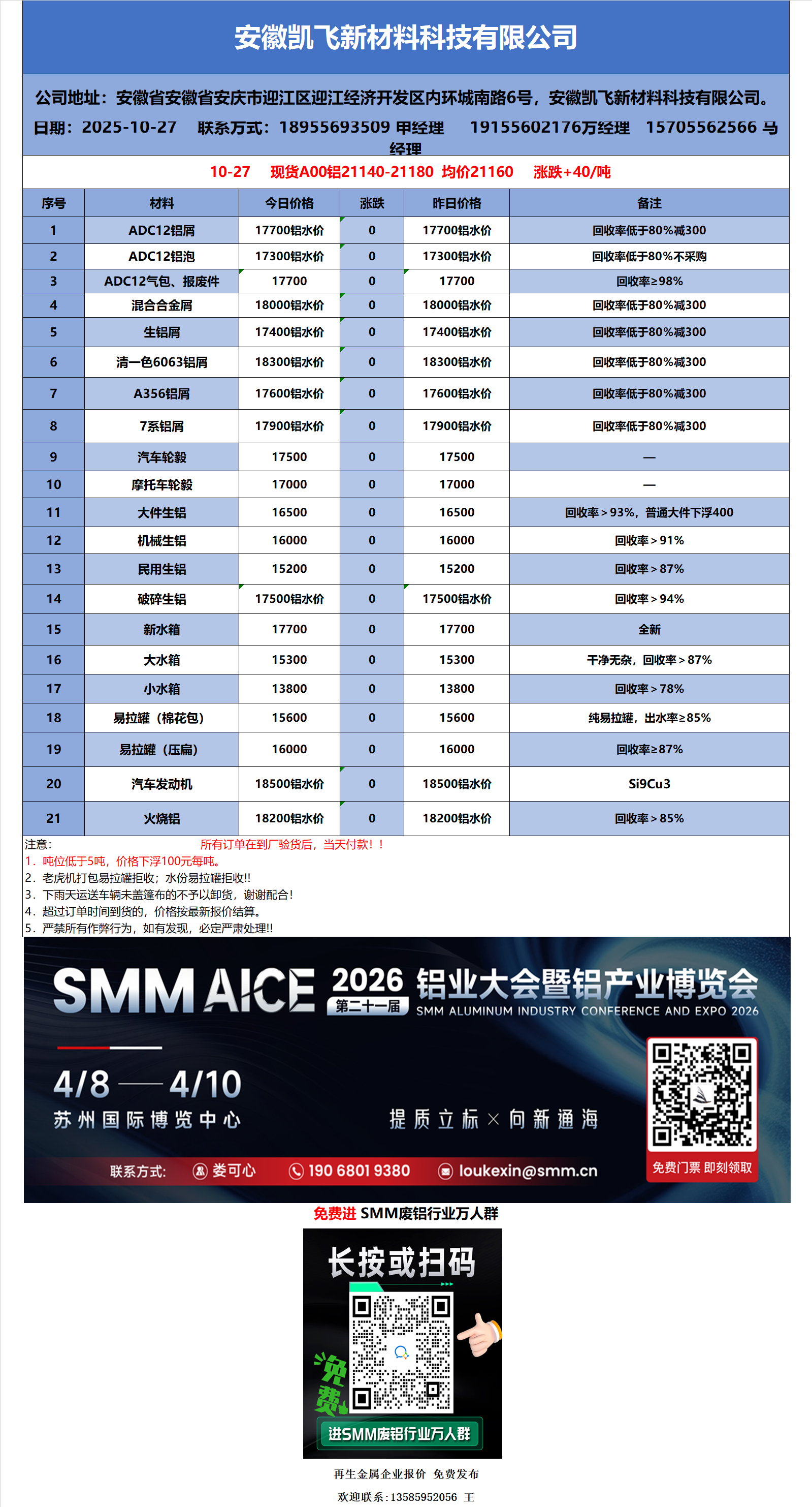 今日安徽凯飞 废铝采购报价已更新,有货的朋友欢迎联系我们!