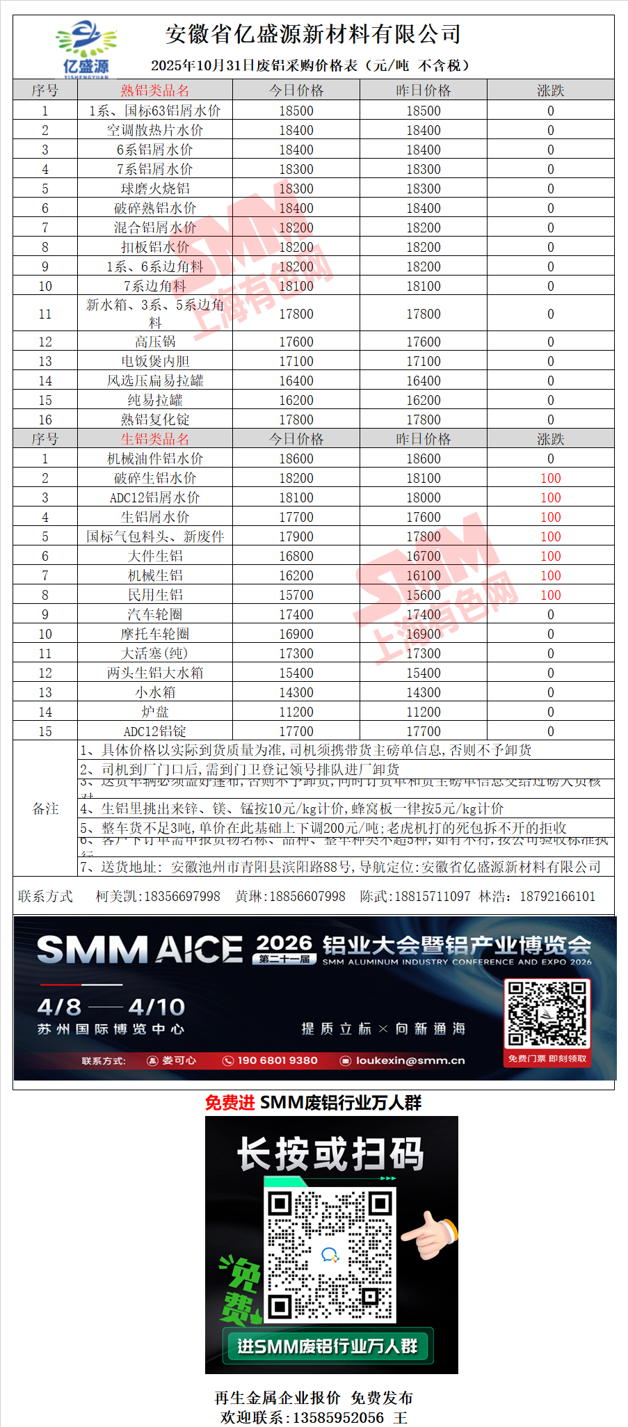 10月31日安徽亿盛源 废铝采购报价