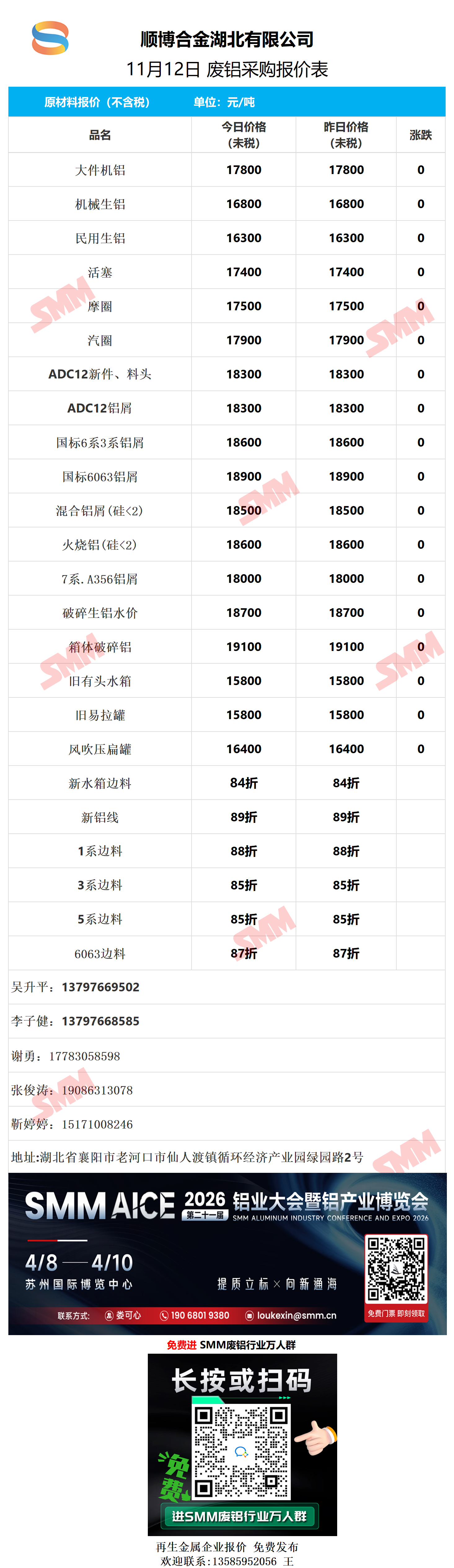 今日顺博合金湖北 废铝采购报价已更新,有货的朋友欢迎联系我们!