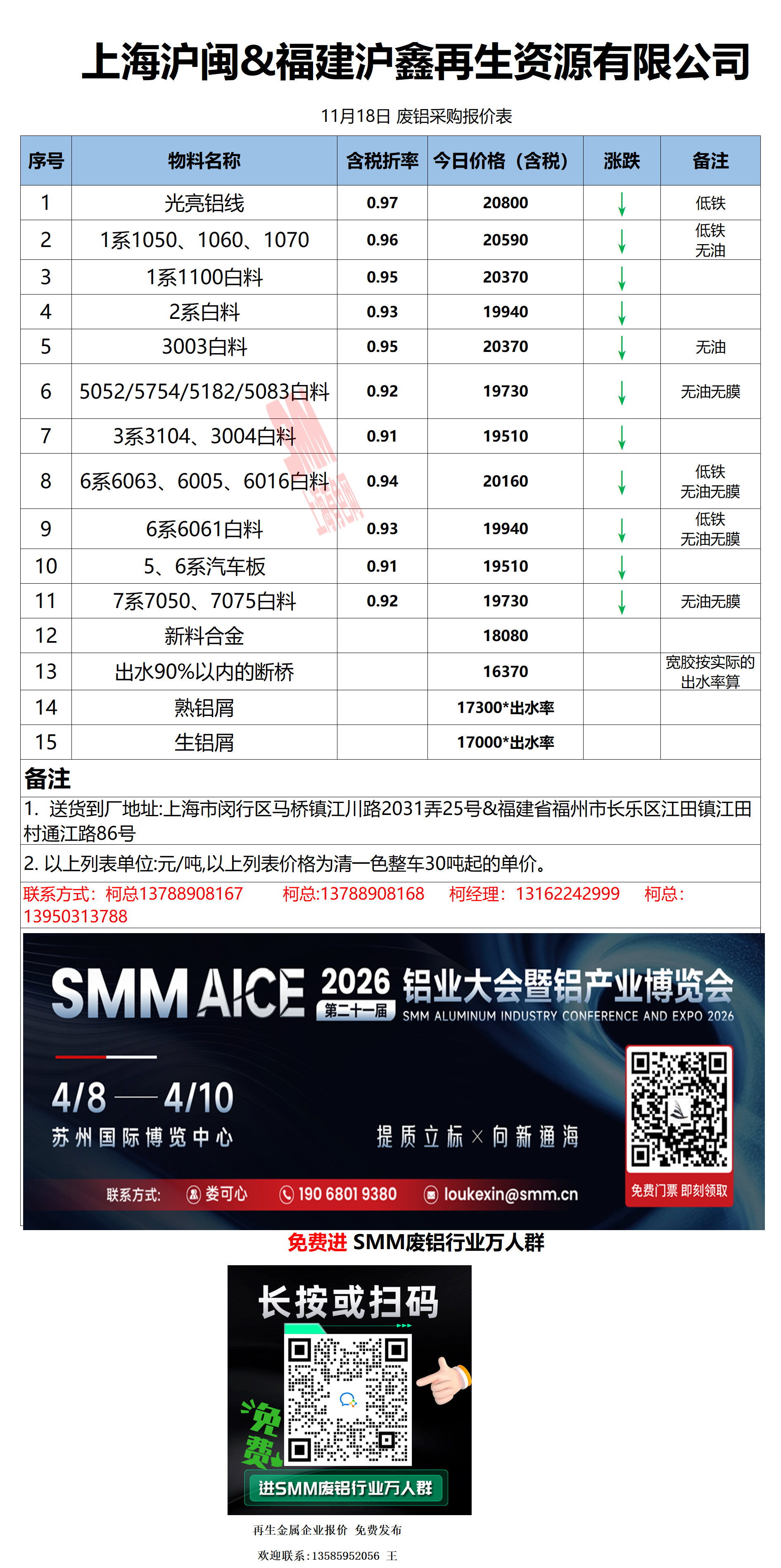 11月18日上海沪闽&福建沪鑫 废铝采购报价