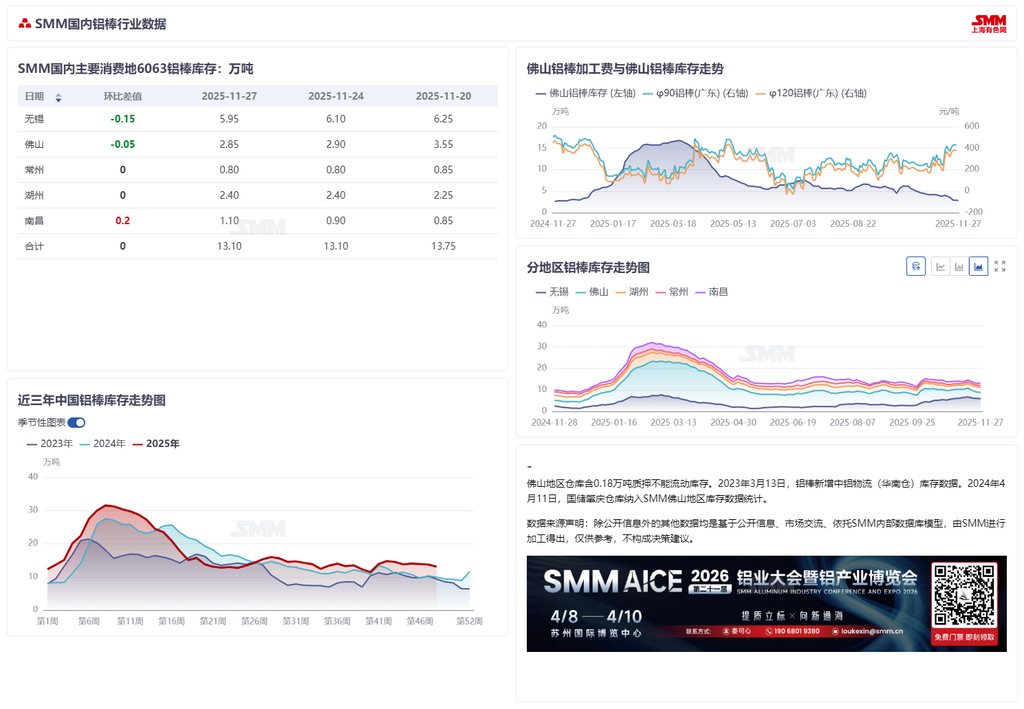 据SMM统计,11月27日国内主流消费地铝棒库存13.10万吨,持平于周一库存,较上周四库存下跌0.65万吨。