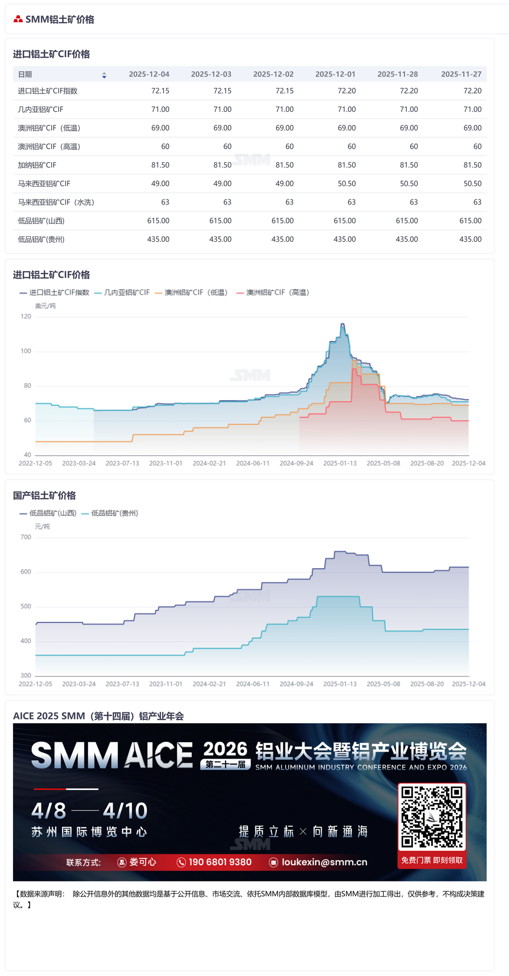 据SMM调研,澳大利亚矿业企业(尤其是铁矿企业)正加速出货,以避免明年年初雨季对发运的影响。当前北大西洋区域运力持续紧张。与此同时,大量船舶将矿产运往亚洲国家(如中国)后,并未承载足够货物通过好望角型船舶返回始发国,空载返航推高了单航次运营成本,预计明年全年运价仍将维持高位。相关企业反馈,几内亚近期出现的柴油供应危机导致其内陆运输效率下降、驳船装运受阻,进一步加剧港口拥堵与延误,使其滞期费用增加,持续强化了运费上涨的市场动力,SMM将持续关注几内亚铝土矿的成交及发运情况。