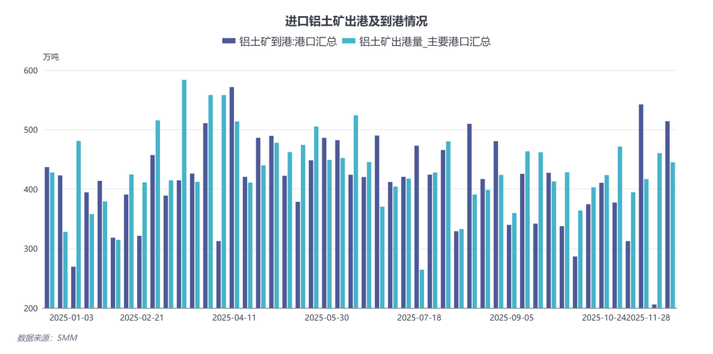 据11月28日数据显示,几内亚主要港口铝土矿周度出港总量为341.21万吨,较前一周增加3.68万吨,几内亚铝土矿发运稳定;澳大利亚主要港口铝土矿周度出港总量为95.71万吨,较前一减少26.29万吨。截至11月27日,我国铝土矿到港量为513.92万吨,较前一周增加308.15万吨。据SMM调研,当前几内亚铝土矿发运量稳定,为远期到港提供支撑。