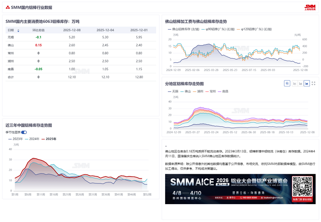 据SMM统计,12月8日国内主流消费地铝棒库存12.10万吨,较上周四库存持平,较上周一库存下跌0.7万吨。