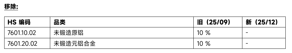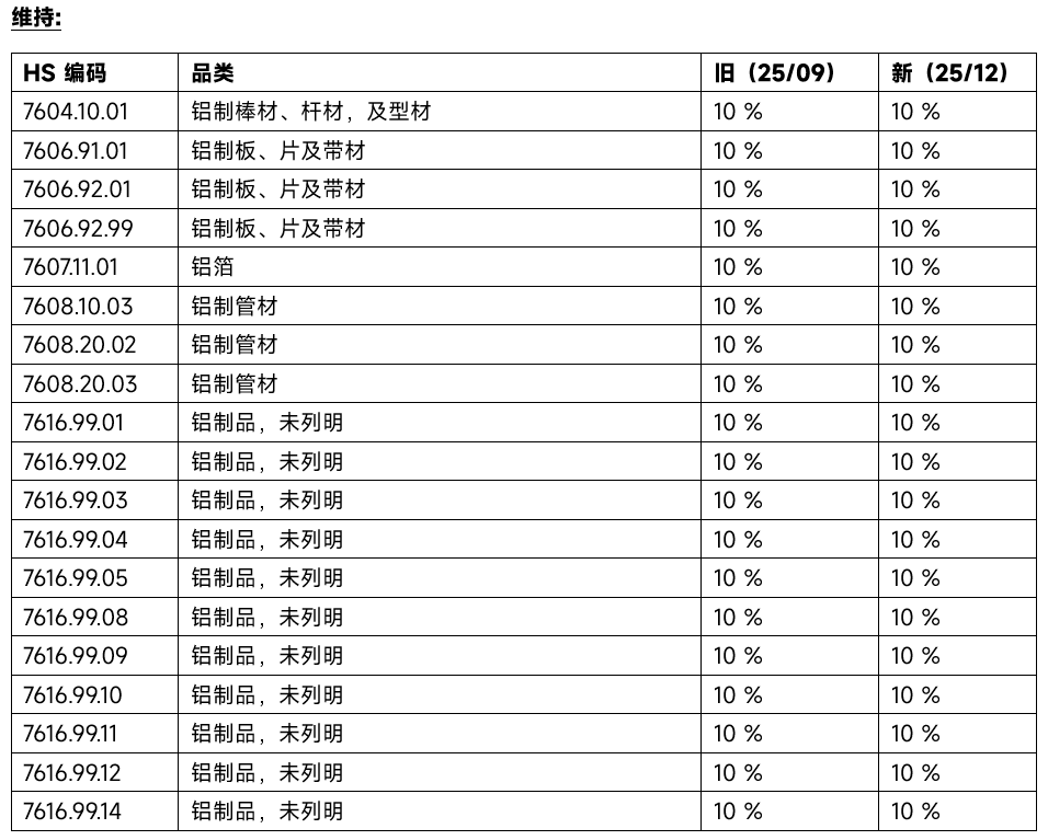 - 其余维持不变的关税税率仍保持10%,主要由中国、美国及土耳其缴纳,三国均为铝制品制造与出口大国。