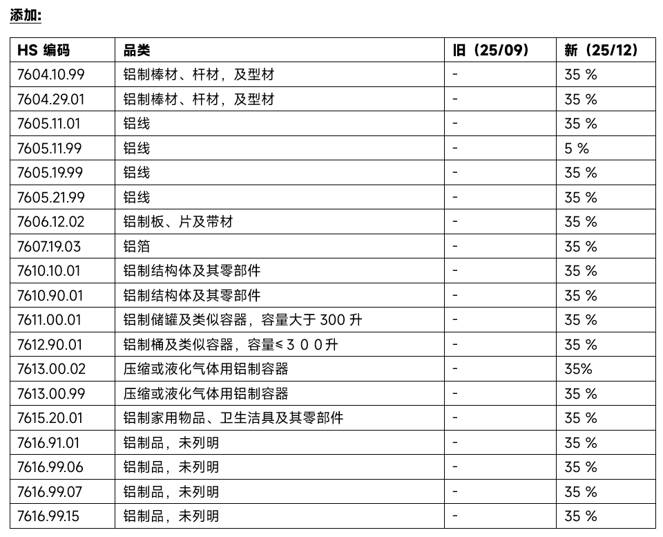 铝作为核心贸易商品,其进口税则与税号遭遇大幅修订。大量相关HS编码将在最新关税改革中面临新税率;其中铝相关HS编码里,共计2条被移除、19条增加及19条维持: