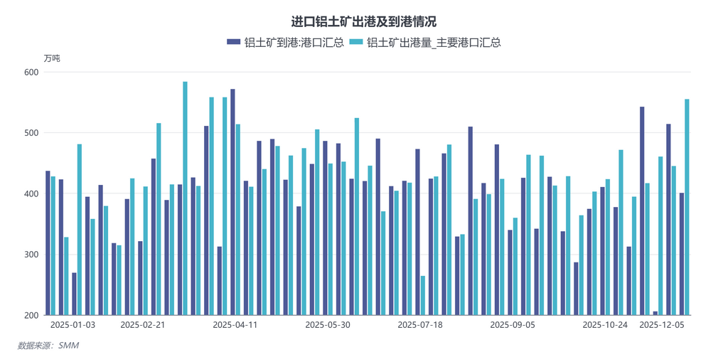据12月5日数据显示,几内亚主要港口铝土矿周度出港总量为412.51万吨,较前一周增加71.24万吨,几内亚铝土矿发运稳定;澳大利亚主要港口铝土矿周度出港总量为127.14万吨,较前一增加31.43万吨。截至12月5日,我国铝土矿到港量为400.63万吨,较前一周减少113.29万吨。据SMM调研,当前几内亚铝土矿发运量稳定,为远期到港提供支撑;据相关客户反馈,当前澳洲雨季前抢发运的现象延续,给予远期到港一定支撑。