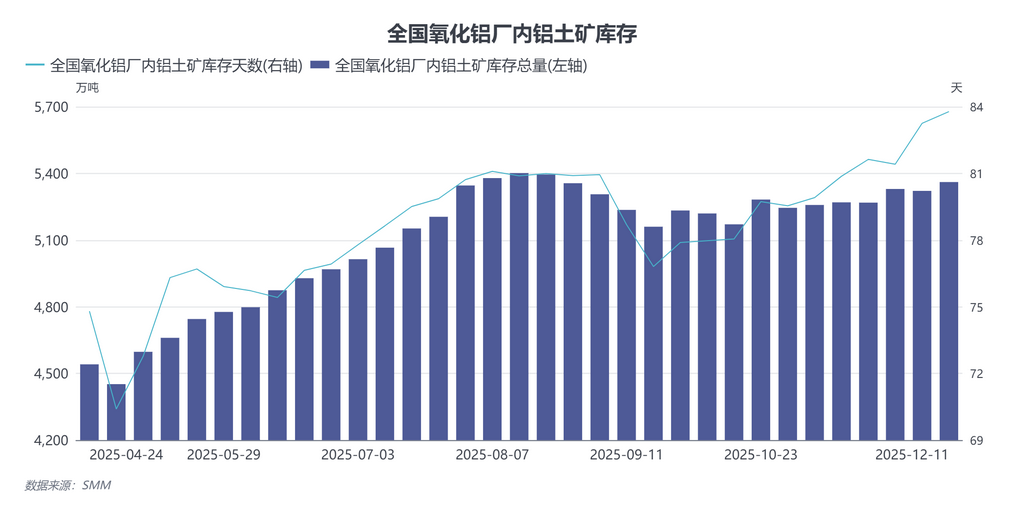 本周国产矿供应偏紧格局延续。据SMM调研,北方地区铝土矿仍处于逐步复产阶段,供矿依旧不稳定,当前国产铝土矿库存量仍然偏低,区域内阶段性供应偏紧压力延续。据SMM数据,截至本周四,氧化铝厂铝土矿库存环比上周减少8.66万吨至5321.2万吨。尽管当前国产矿供应压力偏紧,但铝土矿绝对库存仍处高位,叠加氧化铝价格持续走低,氧化铝厂对加价采购铝土矿的意愿偏低,预计铝土矿价格仍有下跌空间,SMM将持续关注后续矿山生产情况、氧化铝厂累库及矿价走势情况。