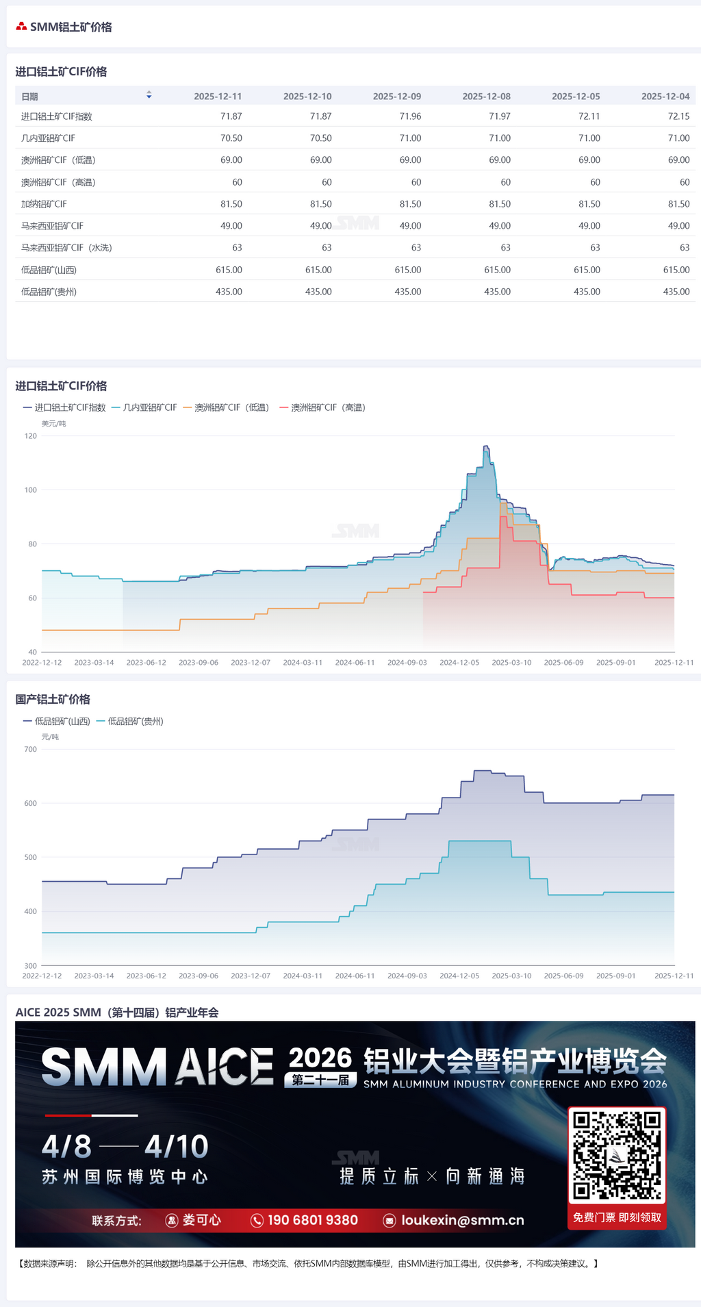 SMM简评:国产铝土矿方面,北方地区铝土矿仍处于逐步复产阶段,供矿依旧不稳定,区域内供应偏紧格局延续,但铝土矿绝对库存量高位及氧化铝价格弱势运行影响下,预计铝土矿价格仍有下降空间,SMM将持续关注后续矿山复产进展、氧化铝厂备货及矿价走势情况;进口铝土矿方面,当前几内亚及澳洲发运稳定,给予远期到港支撑,但需警惕几内亚大选将至可能带来的政策变动。当前进口矿成交清淡,价格整体较前期持平,SMM将持续关注海外铝土矿的发运及价格变化。