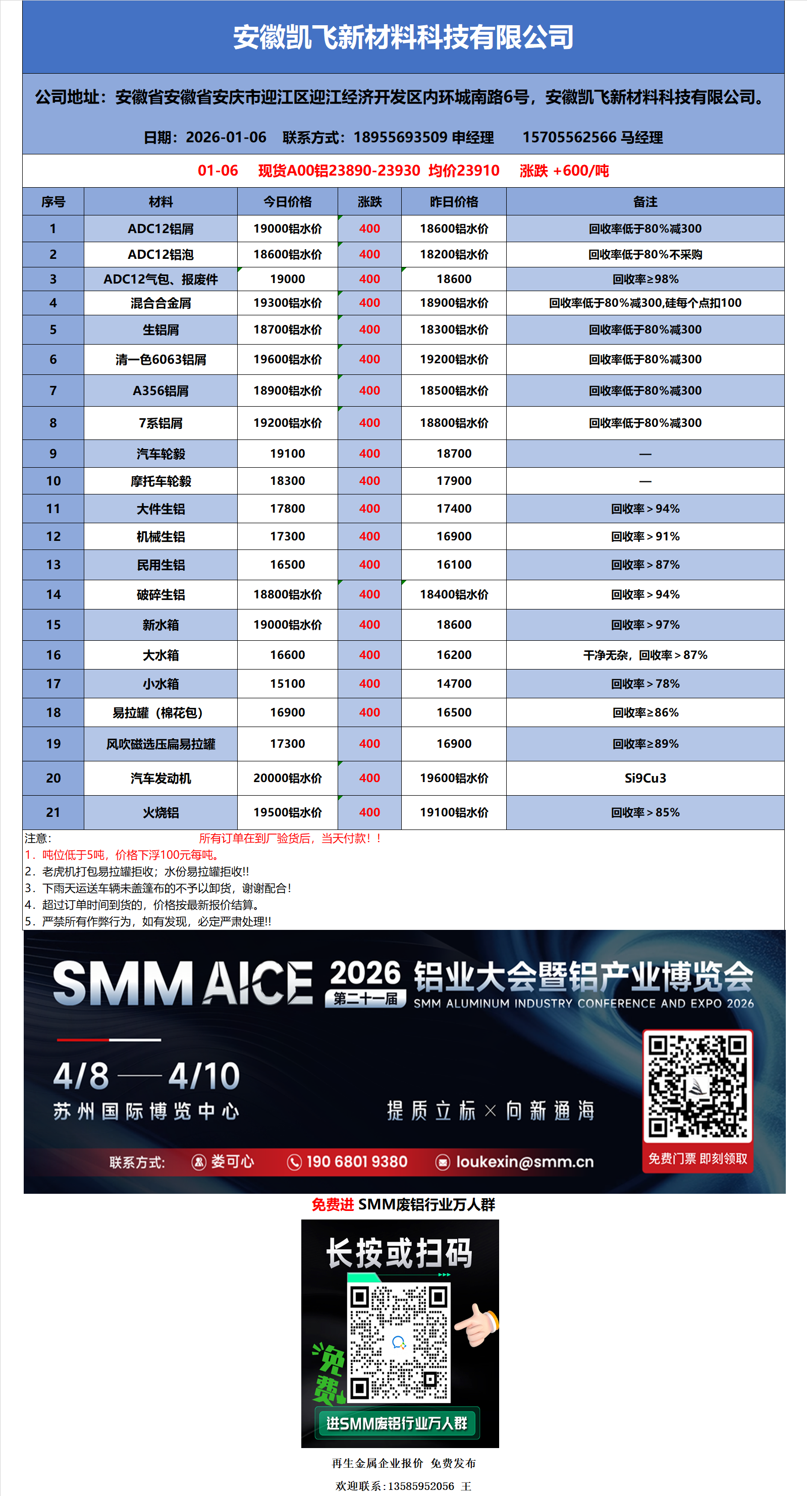 今日安徽凯飞 废铝采购报价已更新,有货的朋友欢迎联系我们!