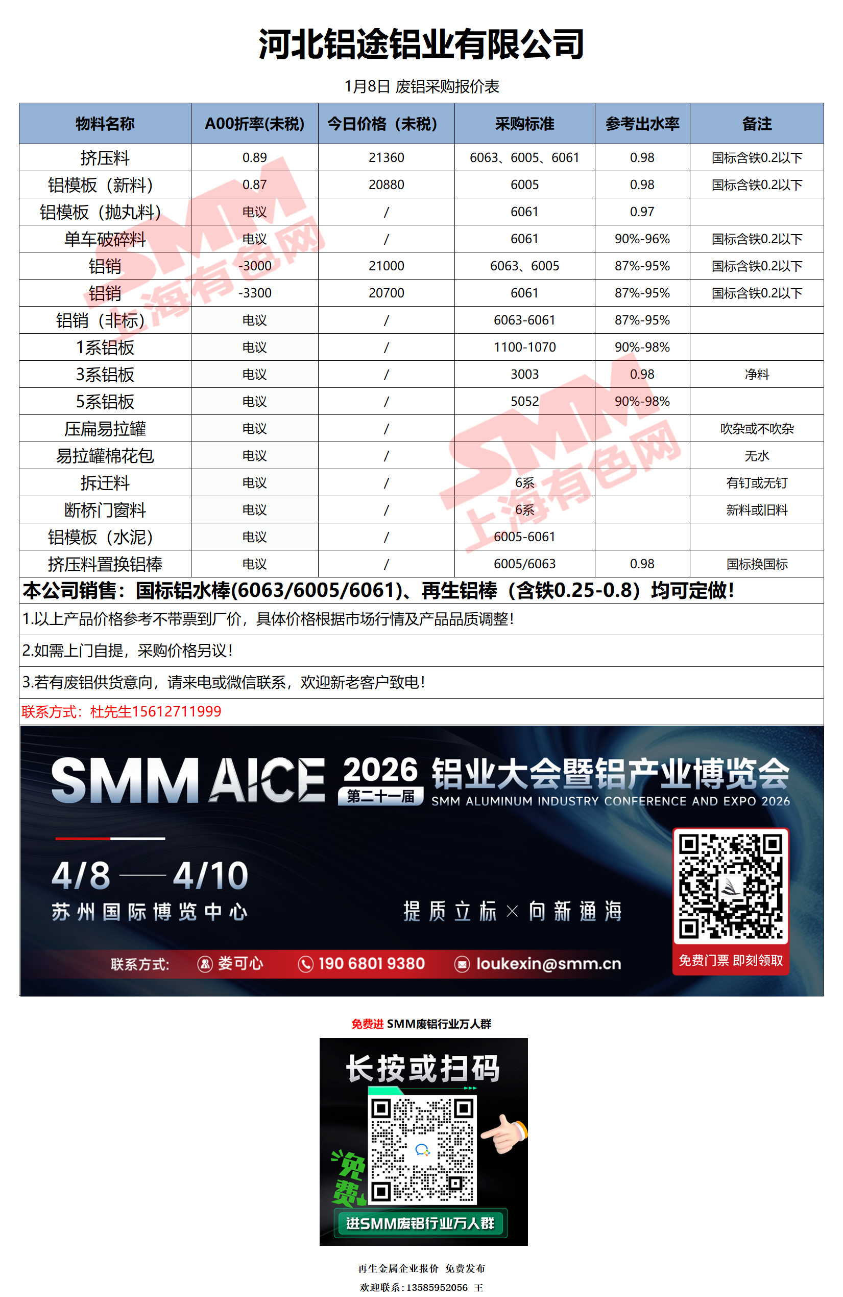 1月8日河北铝途 废铝采购报价