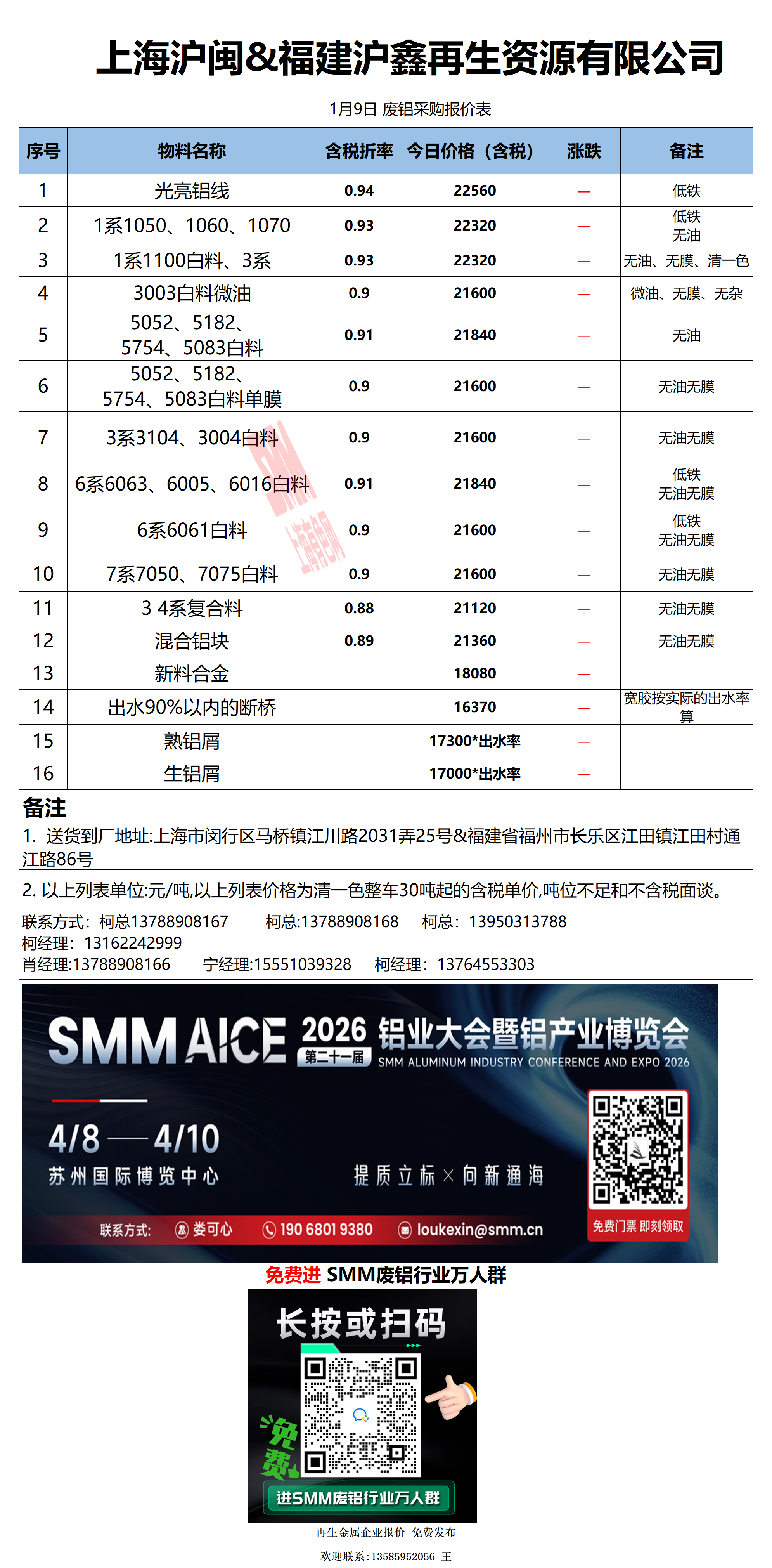 1月9日上海沪闽&福建沪鑫 废铝采购报价