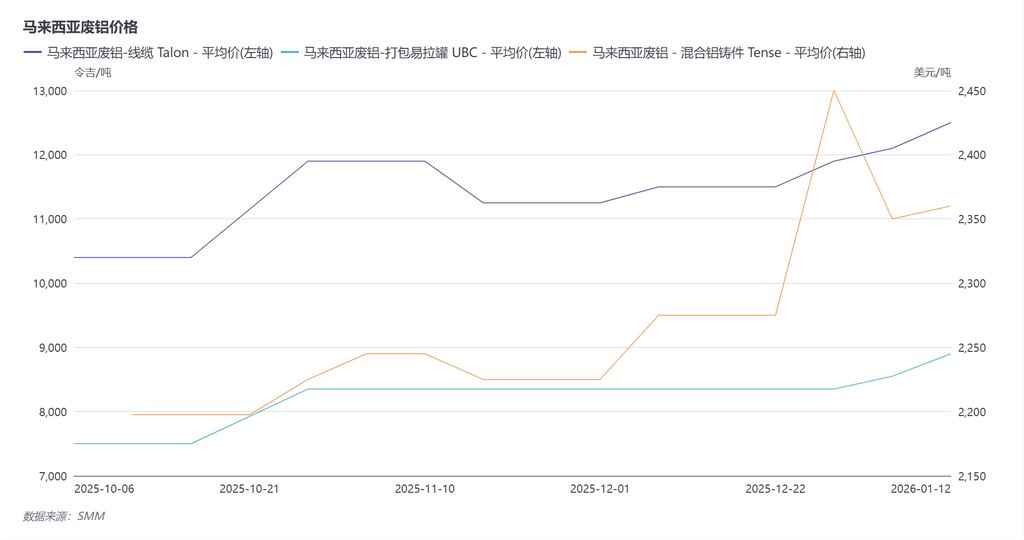 受伦铝强势带动,东南亚废铝市场价格迅速响应,呈现出剧烈的补涨态势。据SMM对2025年10月1日至2026年1月期间的市场调研数据显示,马来西亚与泰国两地的主要废铝品种价格均录得大幅上扬: