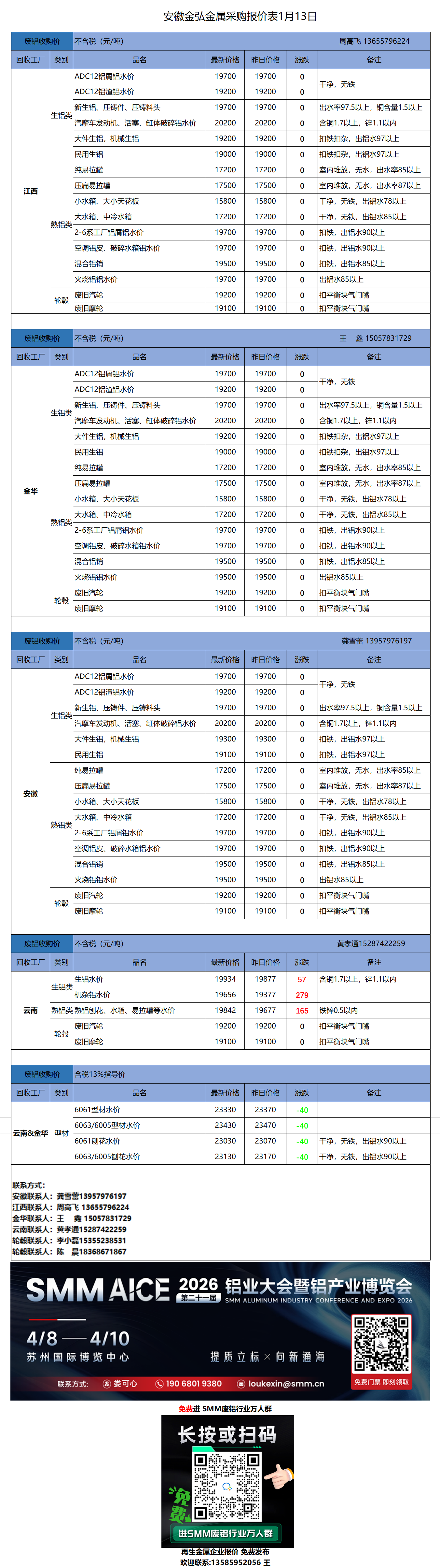 1月13日安徽金弘 废铝采购报价