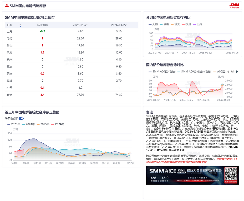 在年初需求端走弱的传导下,再从供应端和库存端来看,SMM最新数据显示,1月26日国内主流消费地电解铝锭库存达77.70万吨,较12月底库存增加11.7万吨,增幅达18%,处于近三年同期高位,且SMM暂预测2026年库存高点有望接近甚至超越2023年126.9万吨的历史峰值。同时,铝水比例的下滑进一步放大了铝锭供给压力——1月下旬国内电解铝企业铝水比例环比下降2.25%至72.64%,同比12月底下降3.00%;折合理论周度铸锭量增加2.5万吨,全月预计新增10万吨左右,环比上月增幅超一成。