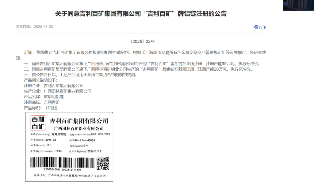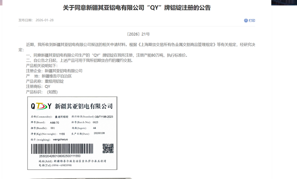 当日,上期所公告新增新疆其亚铝电“QY”牌与吉利百矿集团“吉利百矿”牌铝锭为交割品牌,涉及三家铝厂合计130万吨产能,成为年内铝期货交割市场的重大扩容动作。据SMM数据测算,在无新增铝初级加工企业投产背景下,2026年国内实际新增可交割铝锭量有望超过100万吨。