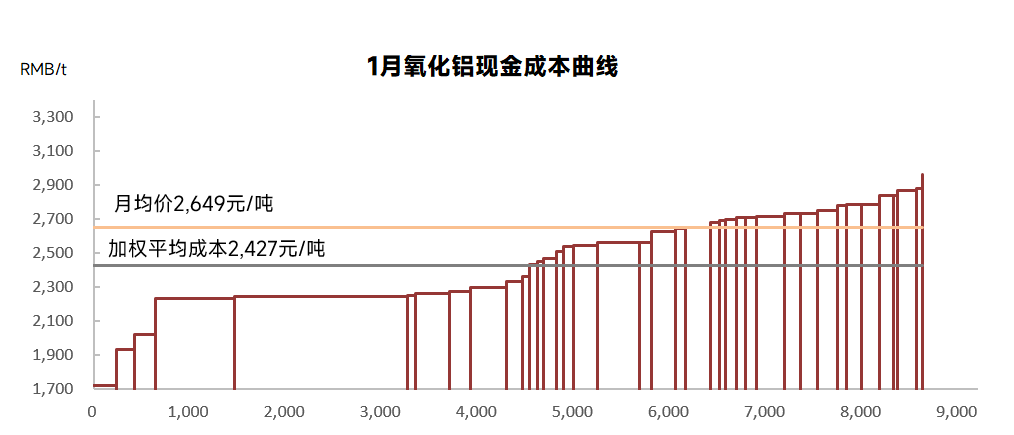 因此,我们预计2月份全国氧化铝加权平均完全成本将进一步下探至2520-2620元/吨,现金成本区间预计降至2350-2400元/吨。