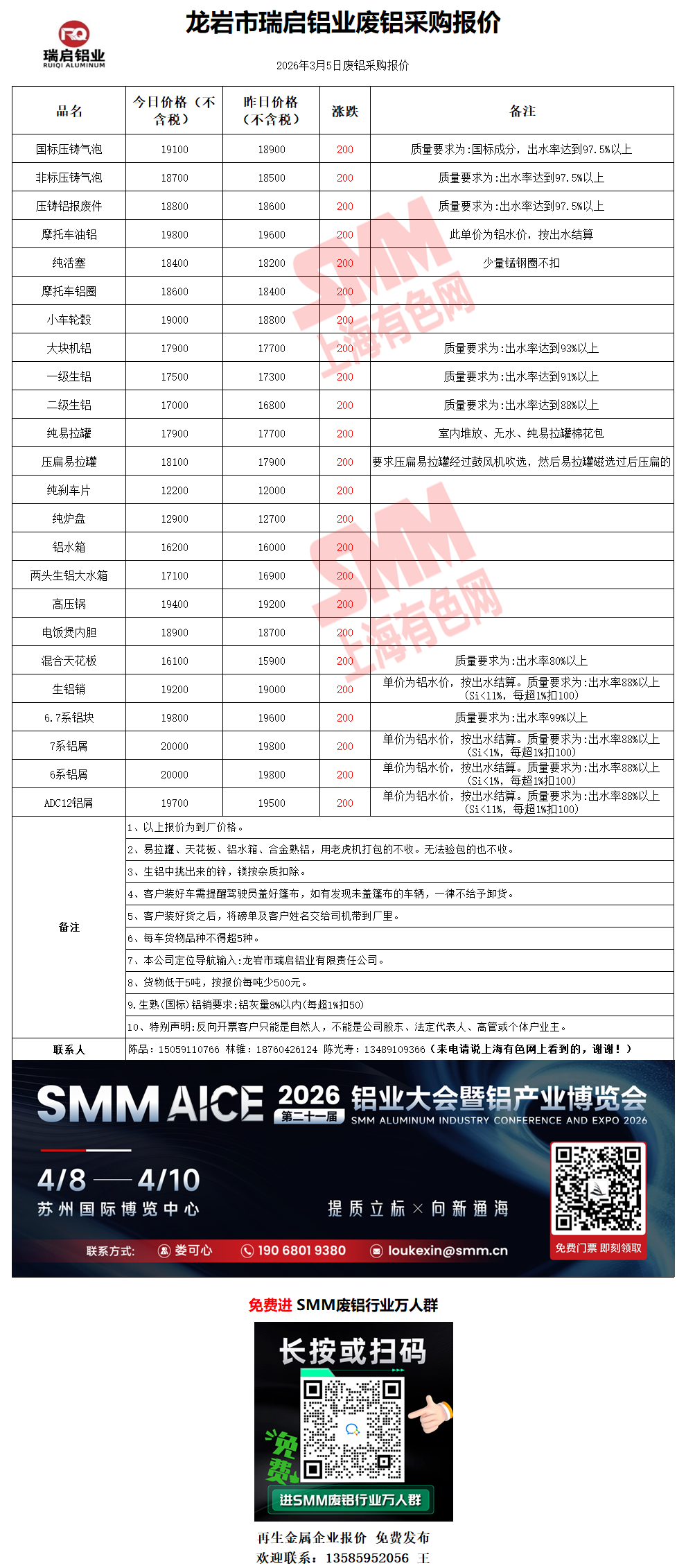 3月5日龙岩瑞启 废铝采购报价