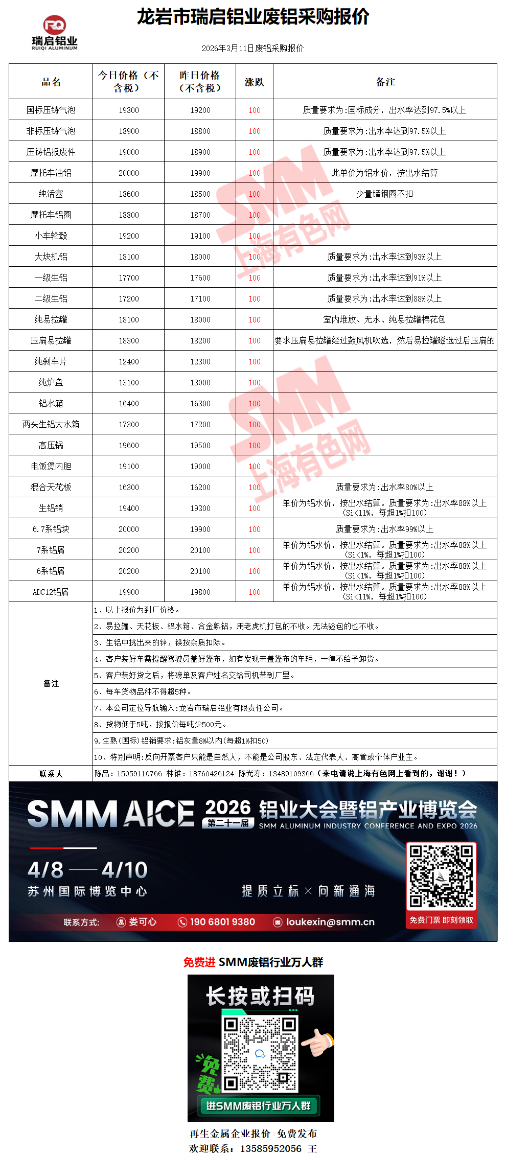 今日龙岩瑞启 废铝采购报价已更新,有货的朋友欢迎联系我们!