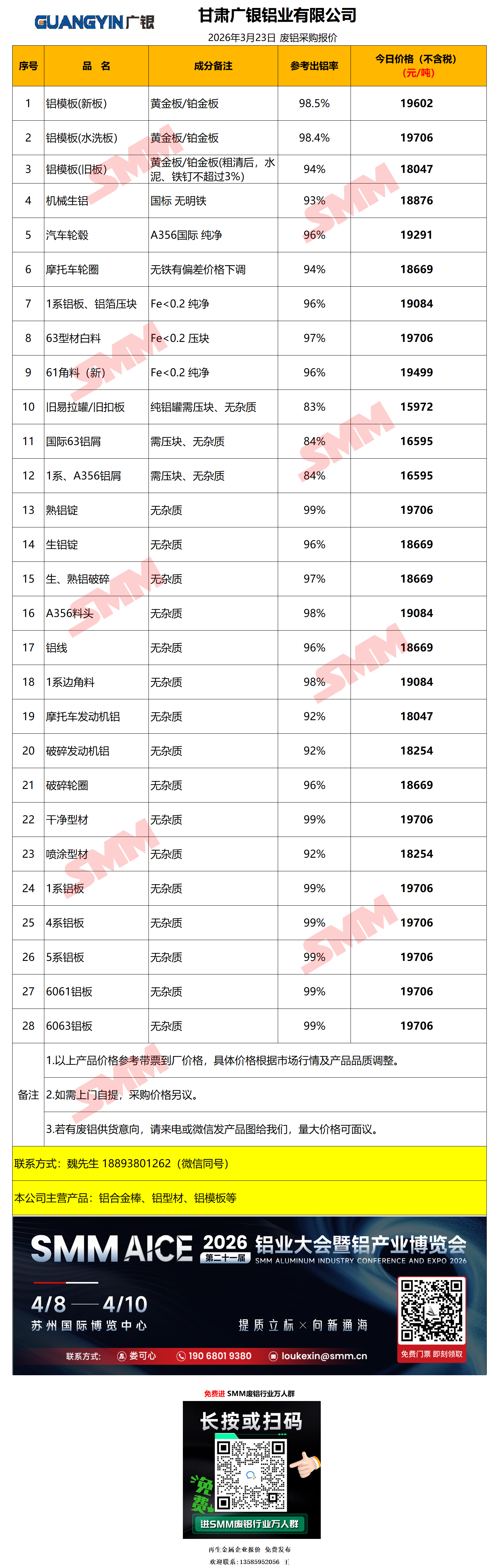 3月23日甘肃广银铝业 废铝采购报价